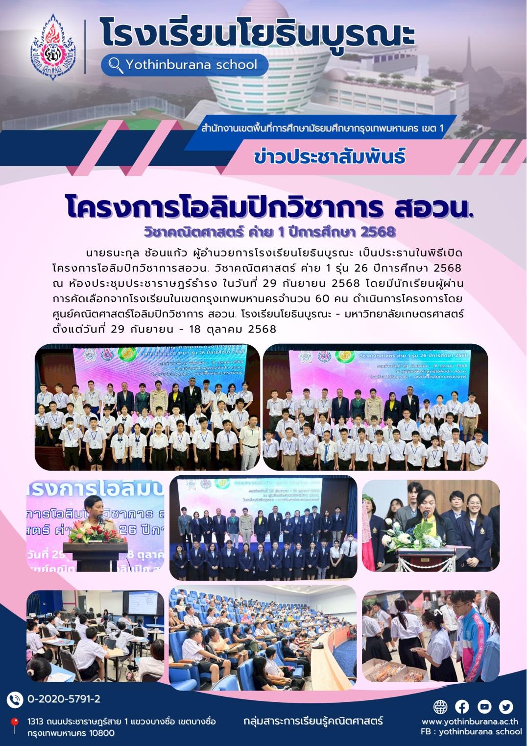 นายธนะกุล ช้อนแก้ว ผู้อำนวยการโรงเรียนโยธินบูรณะ เป็นประธานในพิธีเปิดโครงการโอลิมปิกวิชาการสอวน. วิชาคณิตศาสตร์ ค่าย 1 รุ่น 26 ปีการศึกษา 2568