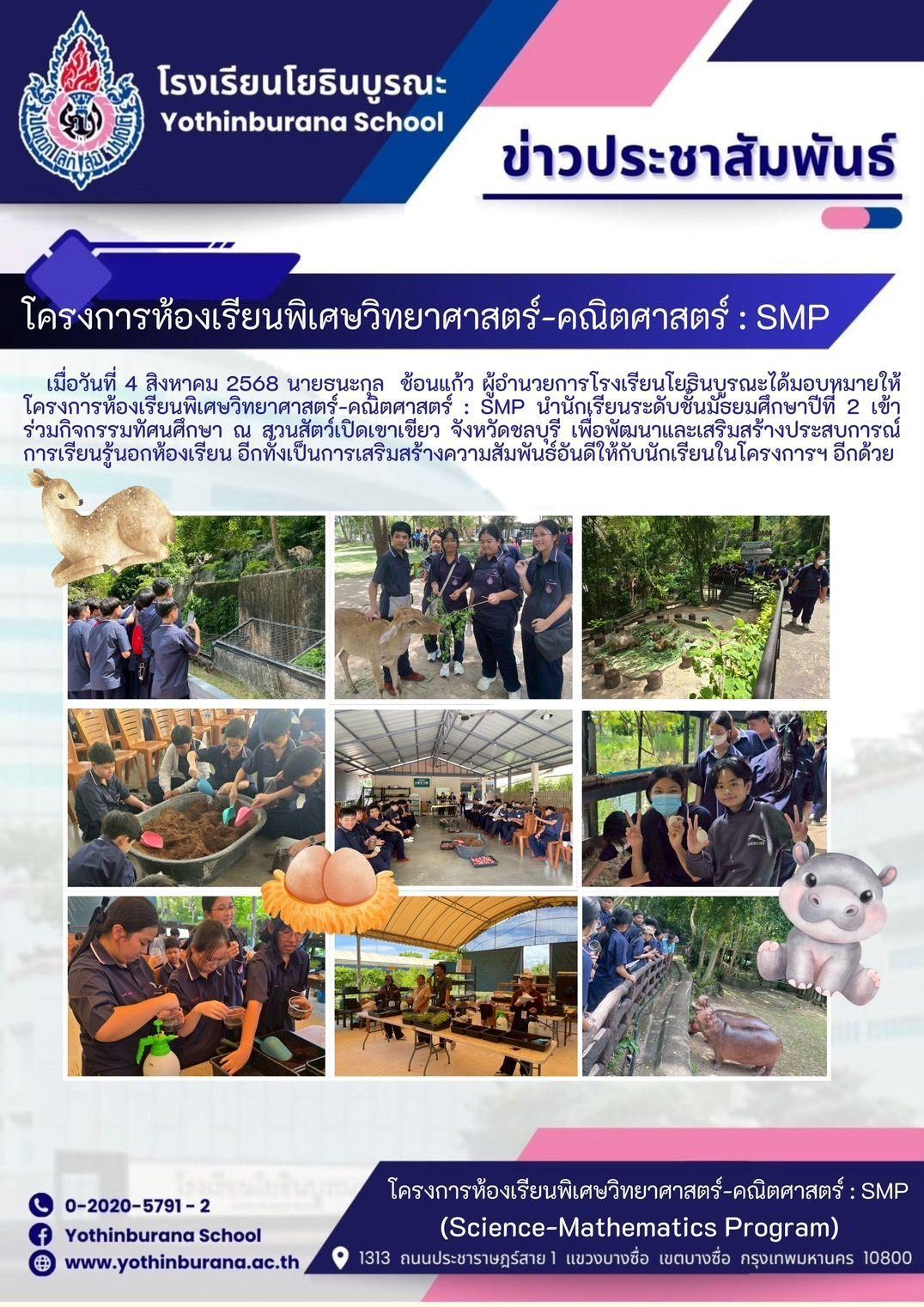 เมื่อวันที่ 4 สิงหาคม 2568 นายธนะกุล ช้อนแก้ว ผู้อำนวยการโรงเรียนโยธินบูรณะได้มอบหมายให้โครงการห้องเรียนพิเศษวิทยาศาสตร์-คณิตศาสตร์ : SMP นำนักเรียนระดับชั้นมัธยมศึกษาปีที่ 2 เข้าร่วมกิจกรรมทัศนศึกษา ณ สวนสัตว์เปิดเขาเขียว จังหวัดชลบุรี เพื่อพัฒนาและเสริมสร้างประสบการณ์การเรียนรู้นอกห้องเรียน อีกทั้งเป็นการเสริมสร้างความสัมพันธ์อันดีให้กับนักเรียนในโครงการฯ อีกด้วย