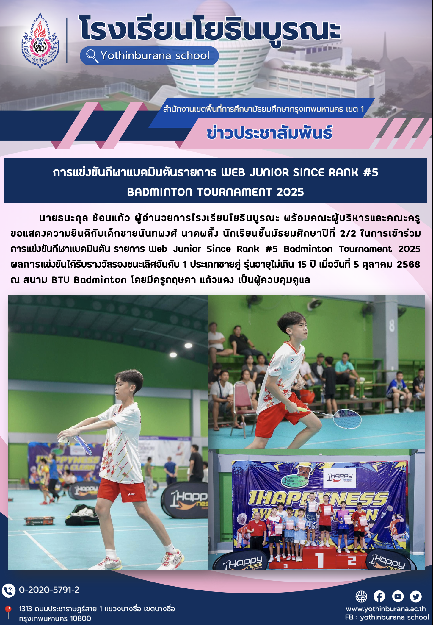 นายธนะกุล ช้อนแก้ว ผู้อำนวยการโรงเรียนโยธินบูรณะ พร้อมคณะผู้บริหารและคณะครู ขอแสดงความยินดีกับเด็กชายนันทพงศ์ นาคพลั้ง นักเรียนชั้นมัธยมศึกษาปีที่ 2/2 ในการเข้าร่วมการแข่งขันกีฬาแบดมินตัน รายการ Web Junior Since Rank #5 Badminton Tournament 2025 ผลการแข่งขันได้รับรางวัลรองชนะเลิศอันดับ 1 ประเภทชายคู่ รุ่นอายุไม่เกิน 15 ปี เมื่อวันที่ 5 ตุลาคม 2568 ณ สนาม BTU Badminton โดยมีครูกฤษดา แก้วแดง เป็นผู้ควบคุมดูแล