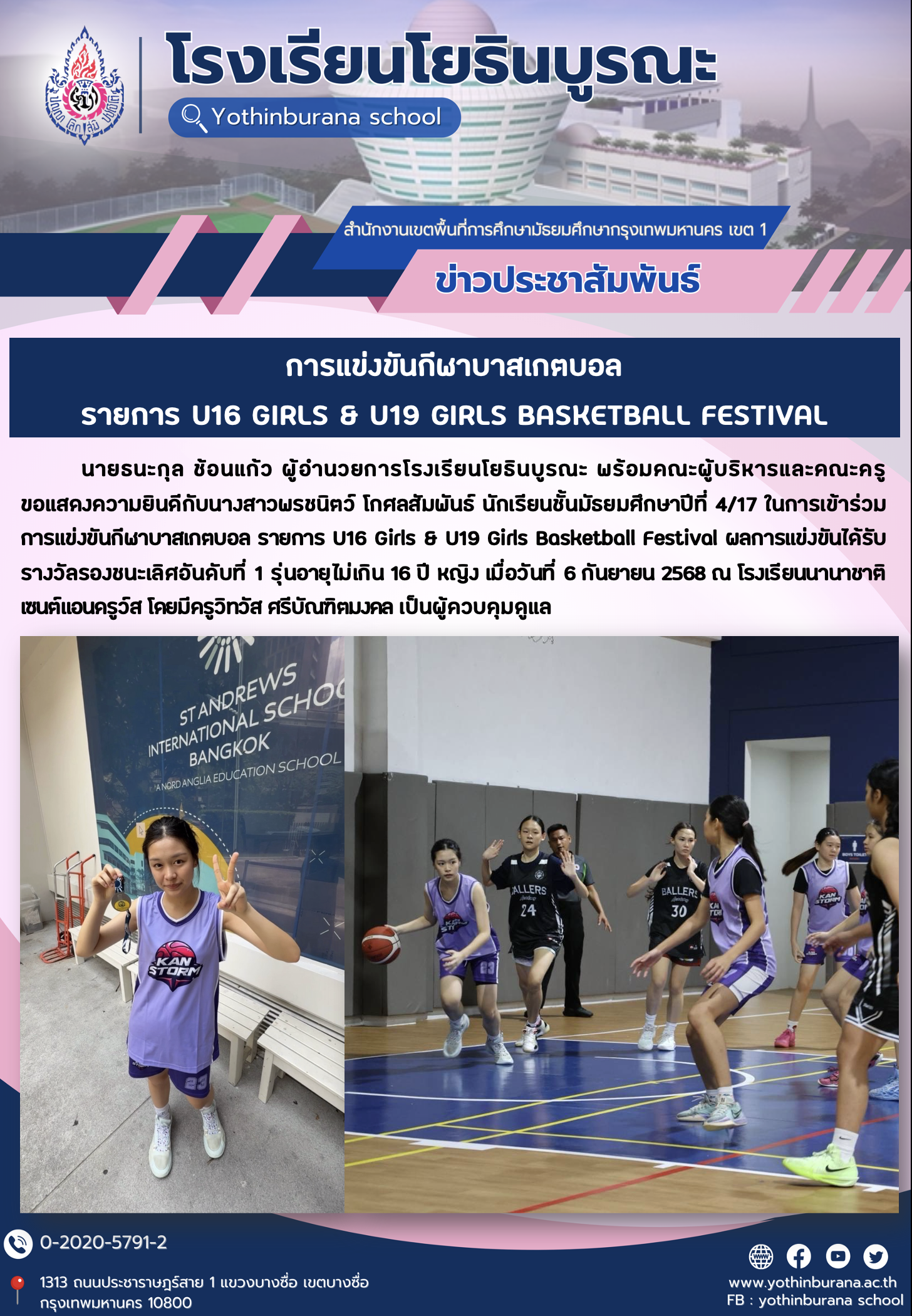 นายธนะกุล ช้อนแก้ว ผู้อำนวยการโรงเรียนโยธินบูรณะ พร้อมคณะผู้บริหารและคณะครู ขอแสดงความยินดีกับนางสาวพรชนิตว์ โกศลสัมพันธ์ นักเรียนชั้นมัธยมศึกษาปีที่ 4/17 ในการเข้าร่วมการแข่งขันกีฬาบาสเกตบอล รายการ U16 Girls & U19 Girls Basketball Festival ผลการแข่งขันได้รับรางวัลรองชนะเลิศอันดับที่ 1 รุ่นอายุไม่เกิน 16 ปี หญิง เมื่อวันที่ 6 กันยายน 2568 ณ โรงเรียนนานาชาติ เซนต์แอนดรูว์ส โดยมีครูวิทวัส ศรีบัณฑิตมงคล เป็นผู้ควบคุมดูแล