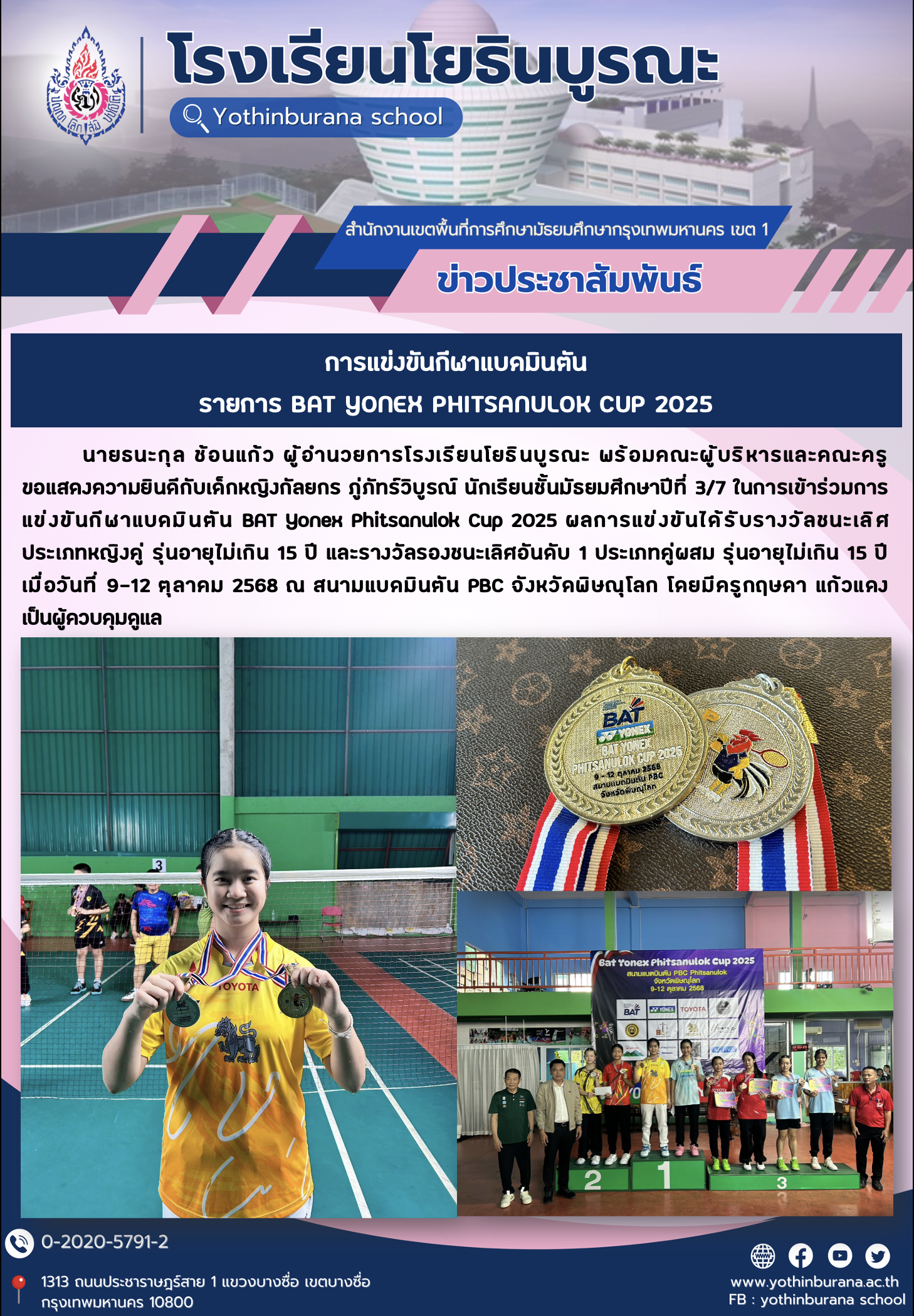 นายธนะกุล ช้อนแก้ว ผู้อำนวยการโรงเรียนโยธินบูรณะ พร้อมคณะผู้บริหารและคณะครู ขอแสดงความยินดีกับเด็กหญิงกัลยกร ภู่ภัทร์วิบูรณ์ นักเรียนชั้นมัธยมศึกษาปีที่ 3/7 ในการเข้าร่วมการแข่งขันกีฬาแบดมินตัน BAT Yonex Phitsanulok Cup 2025 ผลการแข่งขันได้รับรางวัลชนะเลิศ ประเภทหญิงคู่ รุ่นอายุไม่เกิน 15 ปี และรางวัลรองชนะเลิศอันดับ 1 ประเภทคู่ผสม รุ่นอายุไม่เกิน 15 ปี เมื่อวันที่ 9-12 ตุลาคม 2568 ณ สนามแบดมินตัน PBC จังหวัดพิษณุโลก โดยมีครูกฤษดา แก้วแดง เป็นผู้ควบคุมดูแล