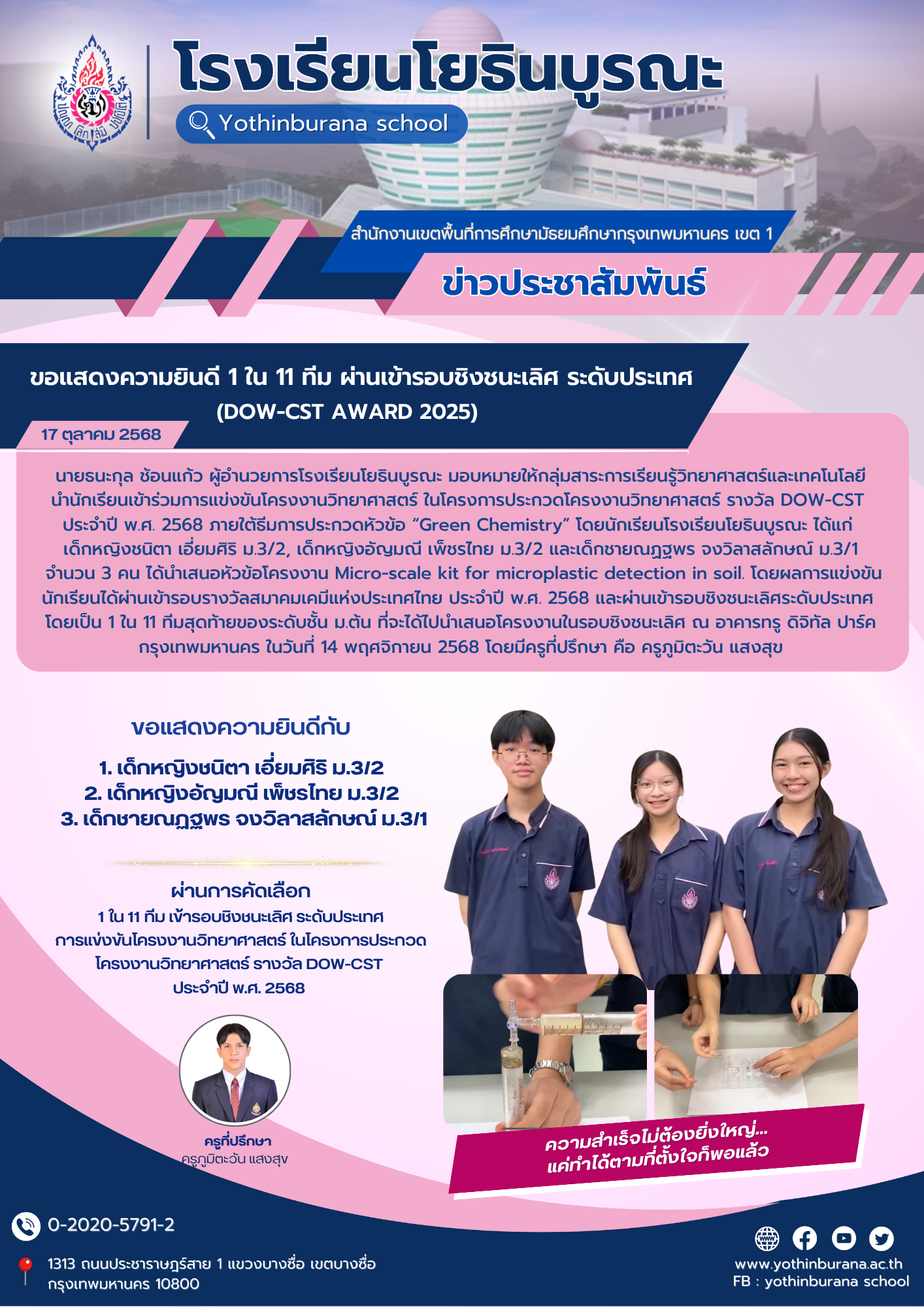 👉นายธนะกุล ช้อนแก้ว ผู้อำนวยการโรงเรียนโยธินบูรณะ มอบหมายให้กลุ่มสาระการเรียนรู้วิทยาศาสตร์และเทคโนโลยี นำนักเรียนเข้าร่วมการแข่งขันโครงงานวิทยาศาสตร์ ในโครงการประกวดโครงงานวิทยาศาสตร์ รางวัล DOW-CST ประจำปี พ.ศ. 2568 ภายใต้ธีมการประกวดหัวข้อ Green Chemistry โดยนักเรียนโรงเรียนโยธินบูรณะ ได้แก่ เด็กหญิงชนิตา เอี่ยมศิริ ม.3/2, เด็กหญิงอัญมณี เพ็ชรไทย ม.3/2 และเด็กชายณฏฐพร จงวิลาสลักษณ์ ม.3/1 จำนวน 3 คน ได้นำเสนอหัวข้อโครงงาน Micro-scale kit for microplastic detection in soil. โดยผลการแข่งขันนักเรียนได้ผ่านเข้ารอบรางวัลสมาคมเคมีแห่งประเทศไทย ประจำปี พ.ศ. 2568 และผ่านเข้ารอบชิงชนะเลิศระดับประเทศ โดยเป็น 1 ใน 11 ทีมสุดท้ายของระดับชั้น ม.ต้น ที่จะได้ไปนำเสนอโครงงานในรอบชิงชนะเลิศ ณ อาคารทรู ดิจิทัล ปาร์ค กรุงเทพมหานคร ในวันที่ 14 พฤศจิกายน 2568 โดยมีครูที่ปรึกษา คือ ครูภูมิตะวัน แสงสุข