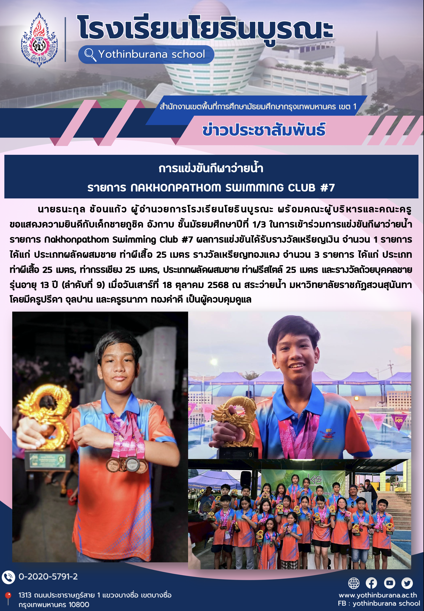 นายธนะกุล ช้อนแก้ว ผู้อำนวยการโรงเรียนโยธินบูรณะ พร้อมคณะผู้บริหารและคณะครู ขอแสดงความยินดีกับเด็กชายภูชิด อังกาบ ชั้นมัธยมศึกษาปีที่ 1/3 ในการเข้าร่วมการแข่งขันกีฬาว่ายน้ำ รายการ Nakhonpathom Swimming Club #7 ผลการแข่งขันได้รับรางวัลเหรียญเงิน จำนวน 1 รายการ ได้แก่ ประเภทผลัดผสมชาย ท่าผีเสื้อ 25 เมตร รางวัลเหรียญทองแดง จำนวน 3 รายการ ได้แก่ ประเภทท่าผีเสื้อ 25 เมตร, ท่ากรรเชียง 25 เมตร, ประเภทผลัดผสมชาย ท่าฟรีสไตล์ 25 เมตร และรางวัลถ้วยบุคคลชาย รุ่นอายุ 13 ปี (ลำดับที่ 9) เมื่อวันเสาร์ที่ 18 ตุลาคม 2568 ณ สระว่ายน้ำ มหาวิทยาลัยราชภัฏสวนสุนันทา โดยมีครูปรีดา จุลปาน และครูธนาภา ทองคำดี เป็นผู้ควบคุมดูแล