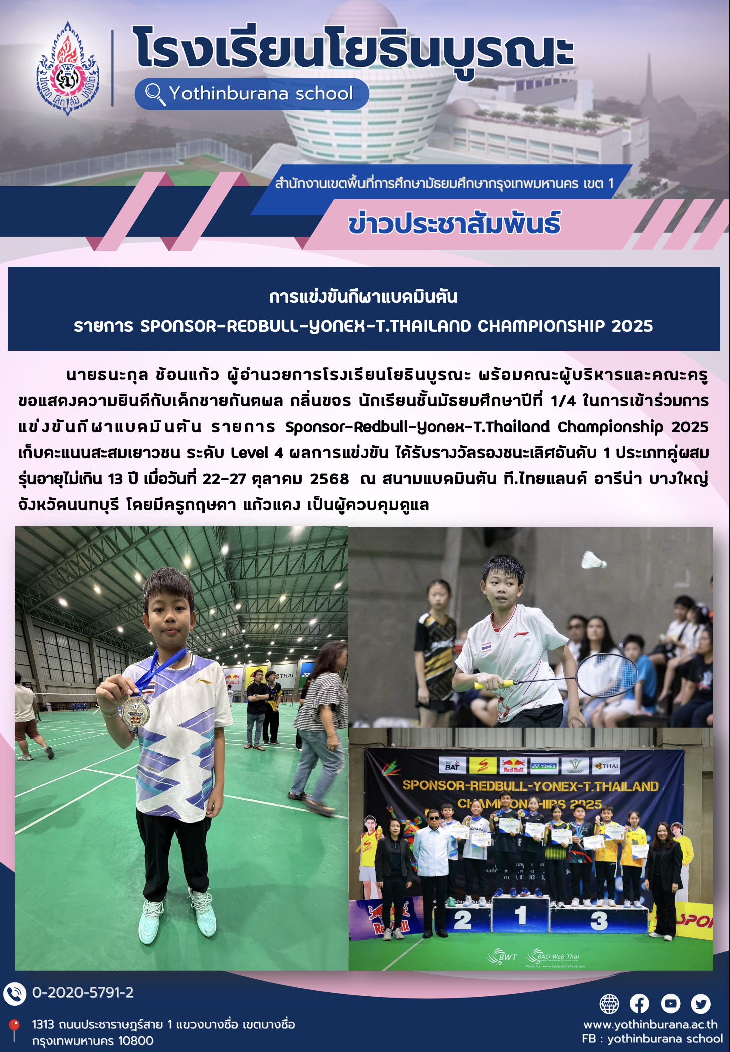 นายธนะกุล ช้อนแก้ว ผู้อำนวยการโรงเรียนโยธินบูรณะ พร้อมคณะผู้บริหารและคณะครู ขอแสดงความยินดีกับเด็กชายกันตพล กลิ่นขจร นักเรียนชั้นมัธยมศึกษาปีที่ 1/4 ในการเข้าร่วมการแข่งขันกีฬาแบดมินตัน รายการ Sponsor-Redbull-Yonex-T.Thailand Championship 2025 เก็บคะแนนสะสมเยาวชน ระดับ Level 4 ผลการแข่งขัน ได้รับรางวัลรองชนะเลิศอันดับ 1 ประเภทคู่ผสม รุ่นอายุไม่เกิน 13 ปี เมื่อวันที่ 22-27 ตุลาคม 2568 ณ สนามแบดมินตัน ที.ไทยแลนด์ อารีน่า บางใหญ่ จังหวัดนนทบุรี โดยมีครูกฤษดา แก้วแดง เป็นผู้ควบคุมดูแล