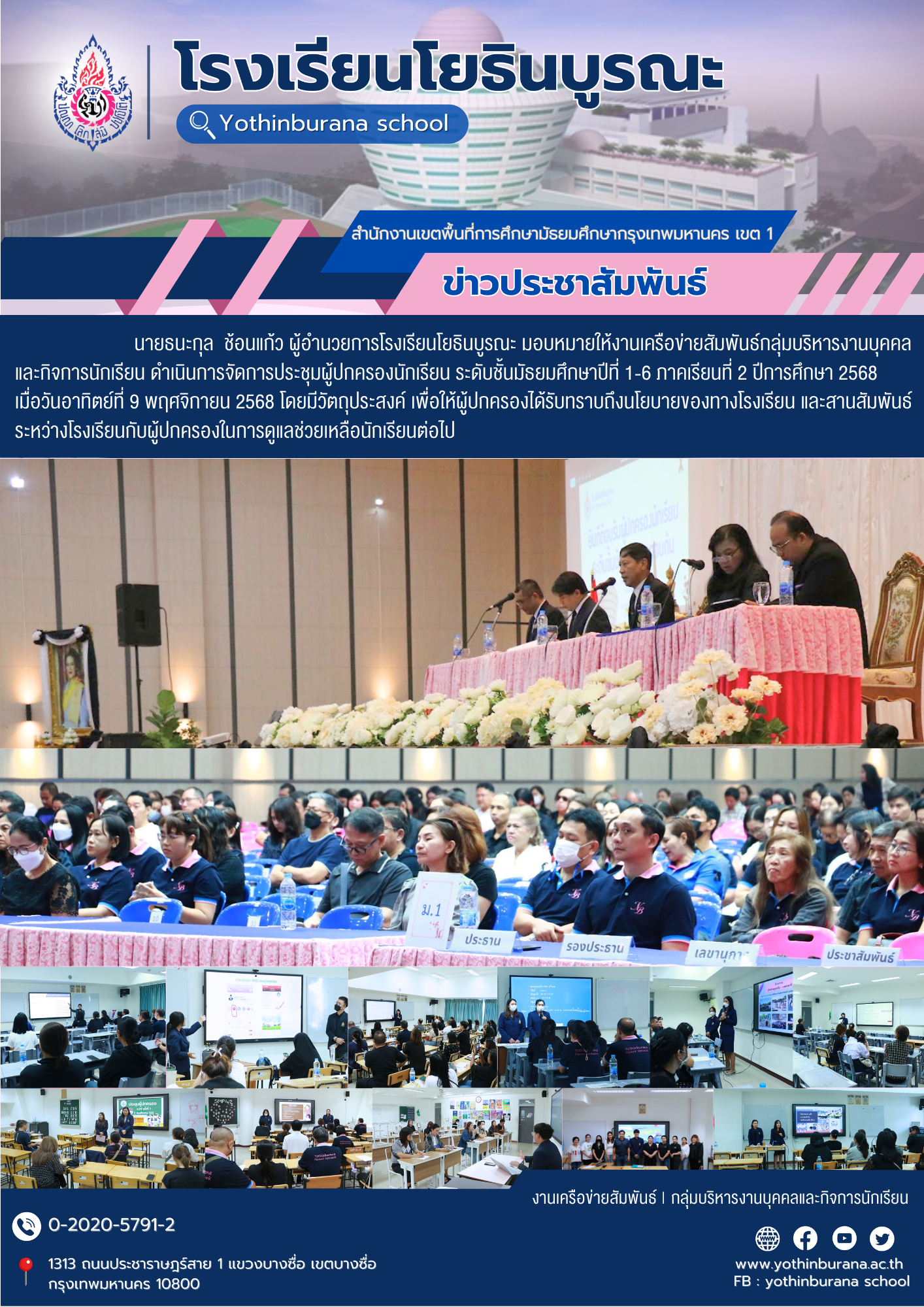 นายธนะกุล ช้อนแก้ว ผู้อำนวยการโรงเรียนโยธินบูรณะ มอบหมายให้งานเครือข่ายสัมพันธ์กลุ่มบริหารงานบุคคลและกิจการนักเรียน ดำเนินการจัดการประชุมผู้ปกครองนักเรียน ระดับชั้นมัธยมศึกษาปีที่ 1-6 ภาคเรียนที่ 2 ปีการศึกษา 2568 เมื่อวันอาทิตย์ที่ 9 พฤศจิกายน 2568 โดยมีวัตถุประสงค์ เพื่อให้ผู้ปกครองได้รับทราบถึงนโยบายของทางโรงเรียน และสานสัมพันธ์ระหว่างโรงเรียนกับผู้ปกครองในการดูแลช่วยเหลือนักเรียนต่อไป