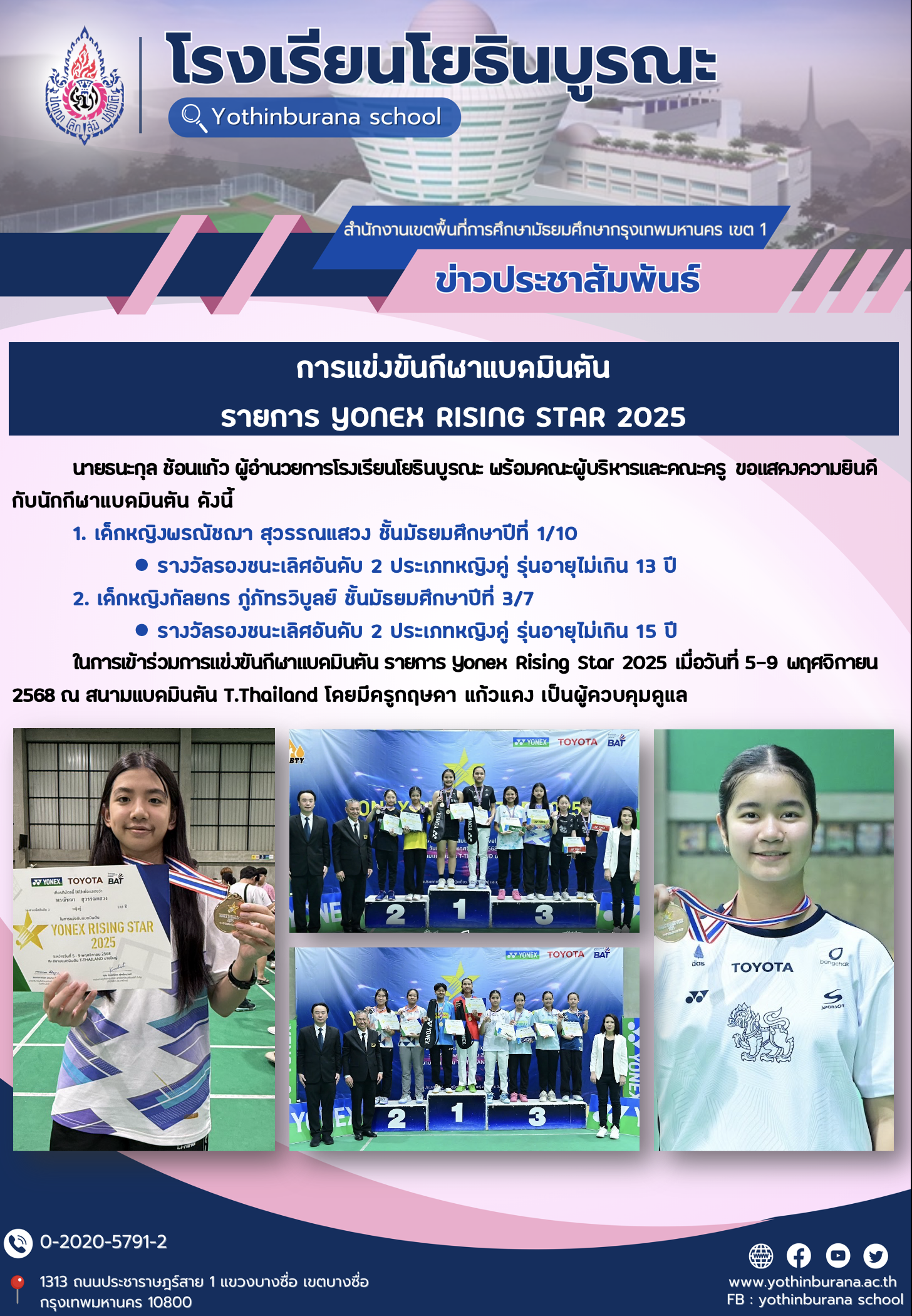 ในการเข้าร่วมการแข่งขันกีฬาแบดมินตัน รายการ Yonex Rising Star 2025 เมื่อวันที่ 5-9 พฤศจิกายน 2568 ณ สนามแบดมินตัน T.Thailand โดยมีครูกฤษดา แก้วแดง เป็นผู้ควบคุมดูแล