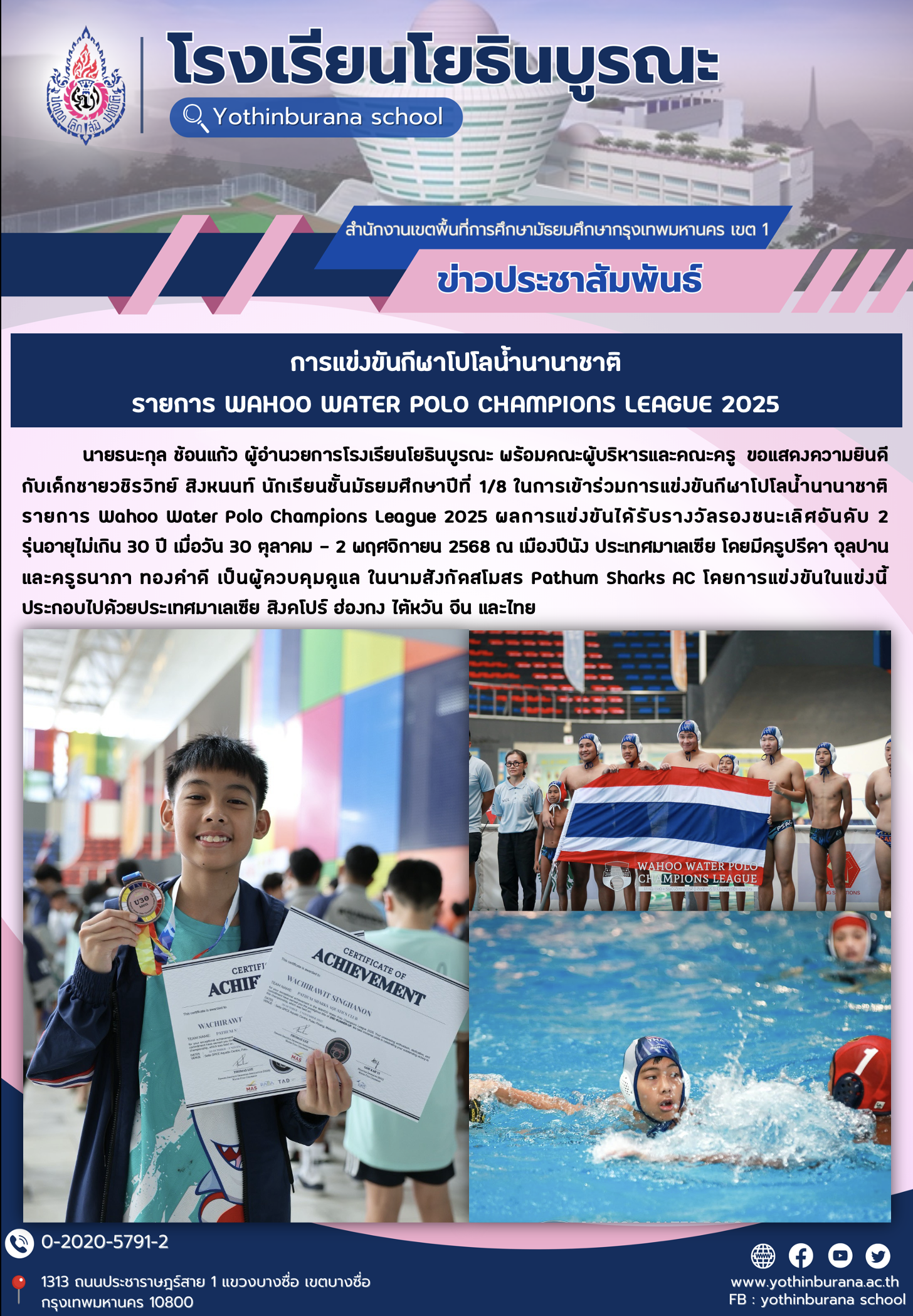 นายธนะกุล ช้อนแก้ว ผู้อำนวยการโรงเรียนโยธินบูรณะ พร้อมคณะผู้บริหารและคณะครู ขอแสดงความยินดีกับเด็กชายวชิรวิทย์ สิงหนนท์ นักเรียนชั้นมัธยมศึกษาปีที่ 1/8 ในการเข้าร่วมการแข่งขันกีฬาโปโลน้ำนานาชาติ รายการ Wahoo Water Polo Champions League 2025 ผลการแข่งขันได้รับรางวัลรองชนะเลิศอันดับ 2 รุ่นอายุไม่เกิน 30 ปี เมื่อวัน 30 ตุลาคม - 2 พฤศจิกายน 2568 ณ เมืองปีนัง ประเทศมาเลเซีย โดยมีครูปรีดา จุลปาน และครูธนาภา ทองคำดี เป็นผู้ควบคุมดูแล ในนามสังกัดสโมสร Pathum Sharks AC โดยการแข่งขันในแข่งนี้ประกอบไปด้วยประเทศมาเลเซีย สิงคโปร์ ฮ่องกง ไต้หวัน จีน และไทย