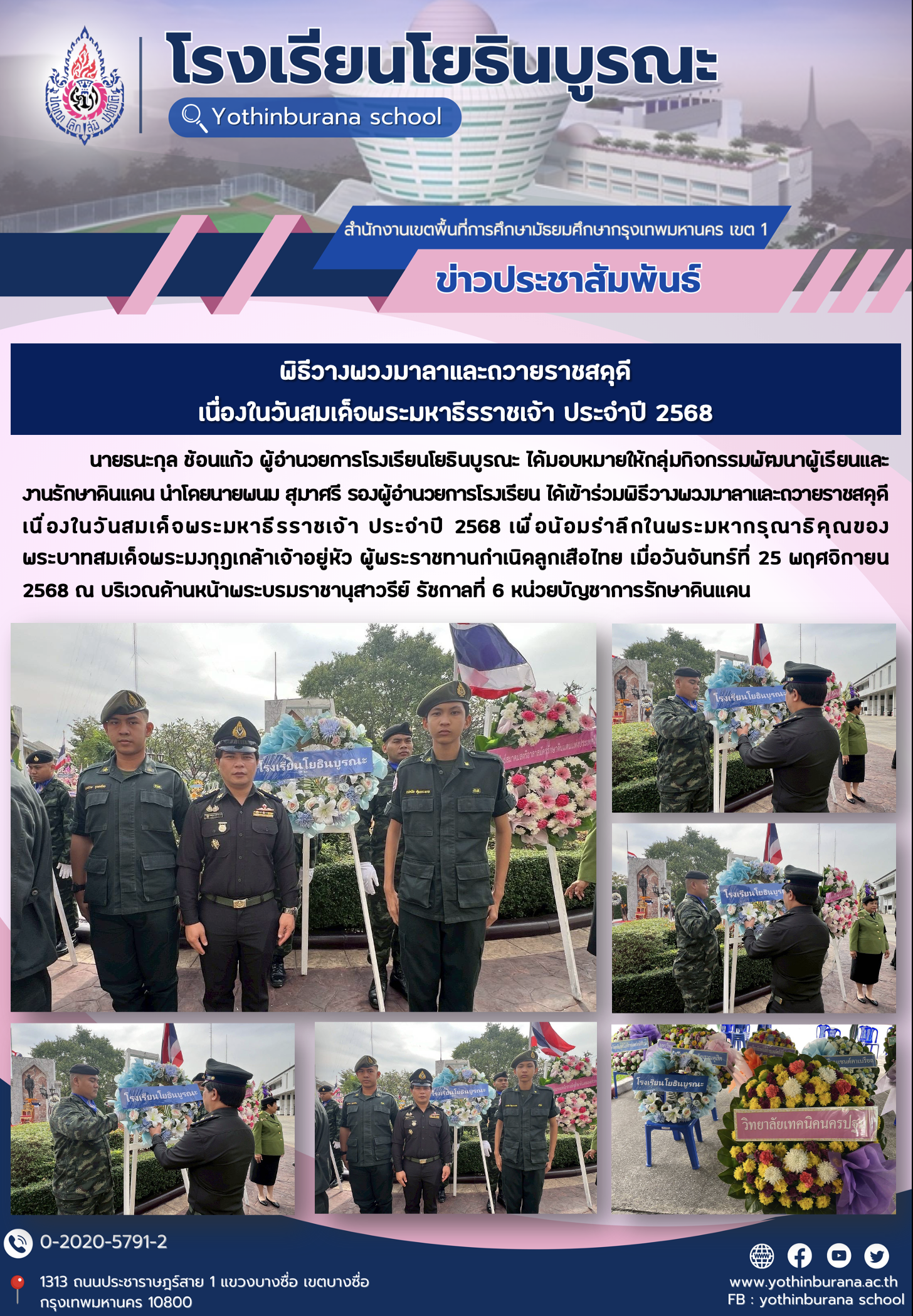 นายธนะกุล ช้อนแก้ว ผู้อำนวยการโรงเรียนโยธินบูรณะ ได้มอบหมายให้กลุ่มกิจกรรมพัฒนาผู้เรียนและงานรักษาดินแดน นำโดยนายพนม สุมาศรี รองผู้อำนวยการโรงเรียน ได้เข้าร่วมพิธีวางพวงมาลาและถวายราชสดุดี เนื่องในวันสมเด็จพระมหาธีรราชเจ้า ประจำปี 2568 เพื่อน้อมรำลึกในพระมหากรุณาธิคุณของพระบาทสมเด็จพระมงกุฎเกล้าเจ้าอยู่หัว ผู้พระราชทานกำเนิดลูกเสือไทย เมื่อวันจันทร์ที่ 25 พฤศจิกายน 2568 ณ บริเวณด้านหน้าพระบรมราชานุสาวรีย์ รัชกาลที่ 6 หน่วยบัญชาการรักษาดินแดน