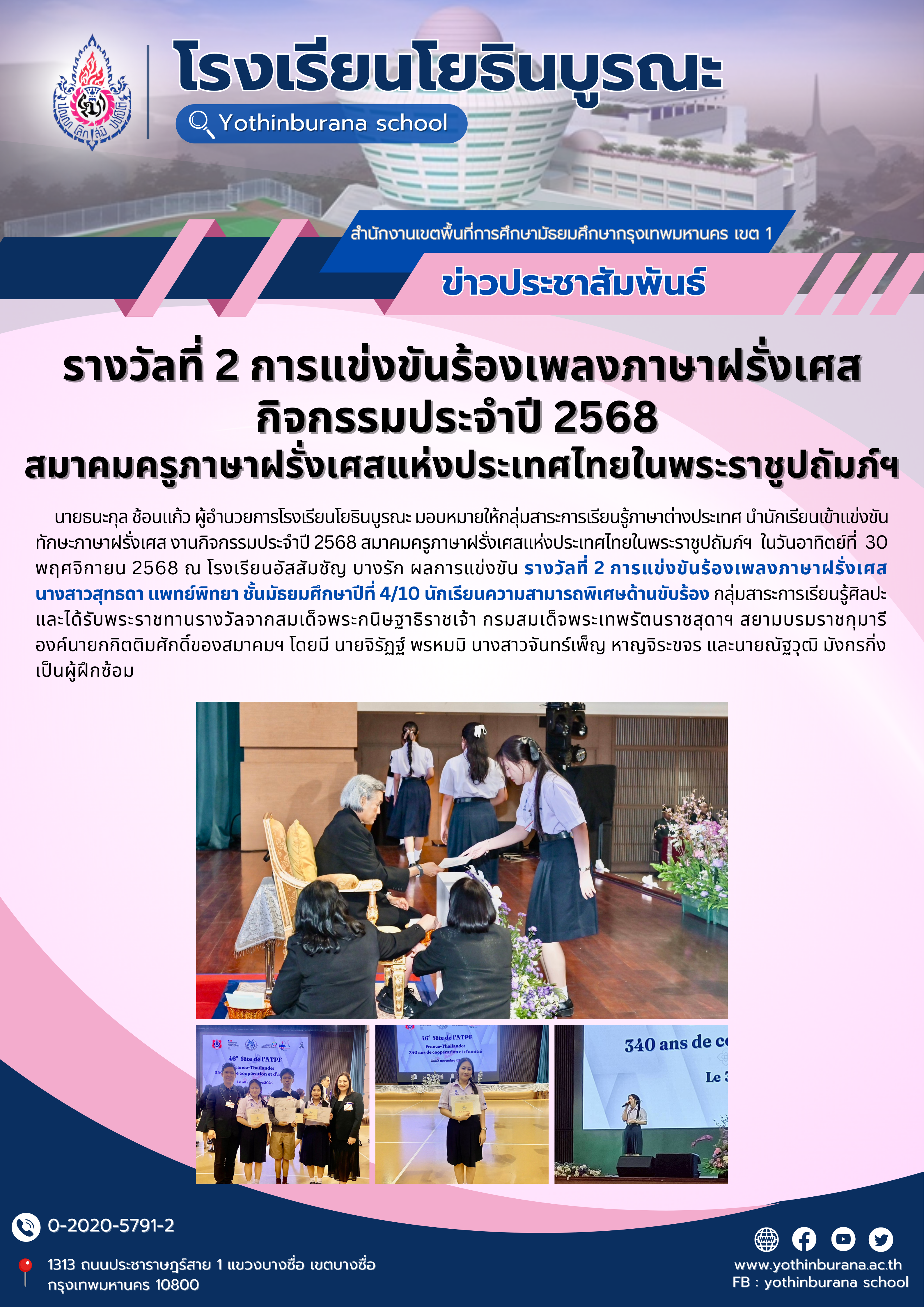 นายธนะกุล ช้อนแก้ว ผู้อำนวยการโรงเรียนโยธินบูรณะ มอบหมายให้กลุ่มสาระการเรียนรู้ภาษาต่างประเทศ นำนักเรียนเข้าแข่งขันทักษะภาษาฝรั่งเศส งานกิจกรรมประจำปี 2568 สมาคมครูภาษาฝรั่งเศสแห่งประเทศไทยในพระราชูปถัมภ์ฯ ในวันอาทิตย์ที่ 30 พฤศจิกายน 2568 ณ โรงเรียนอัสสัมชัญ บางรัก