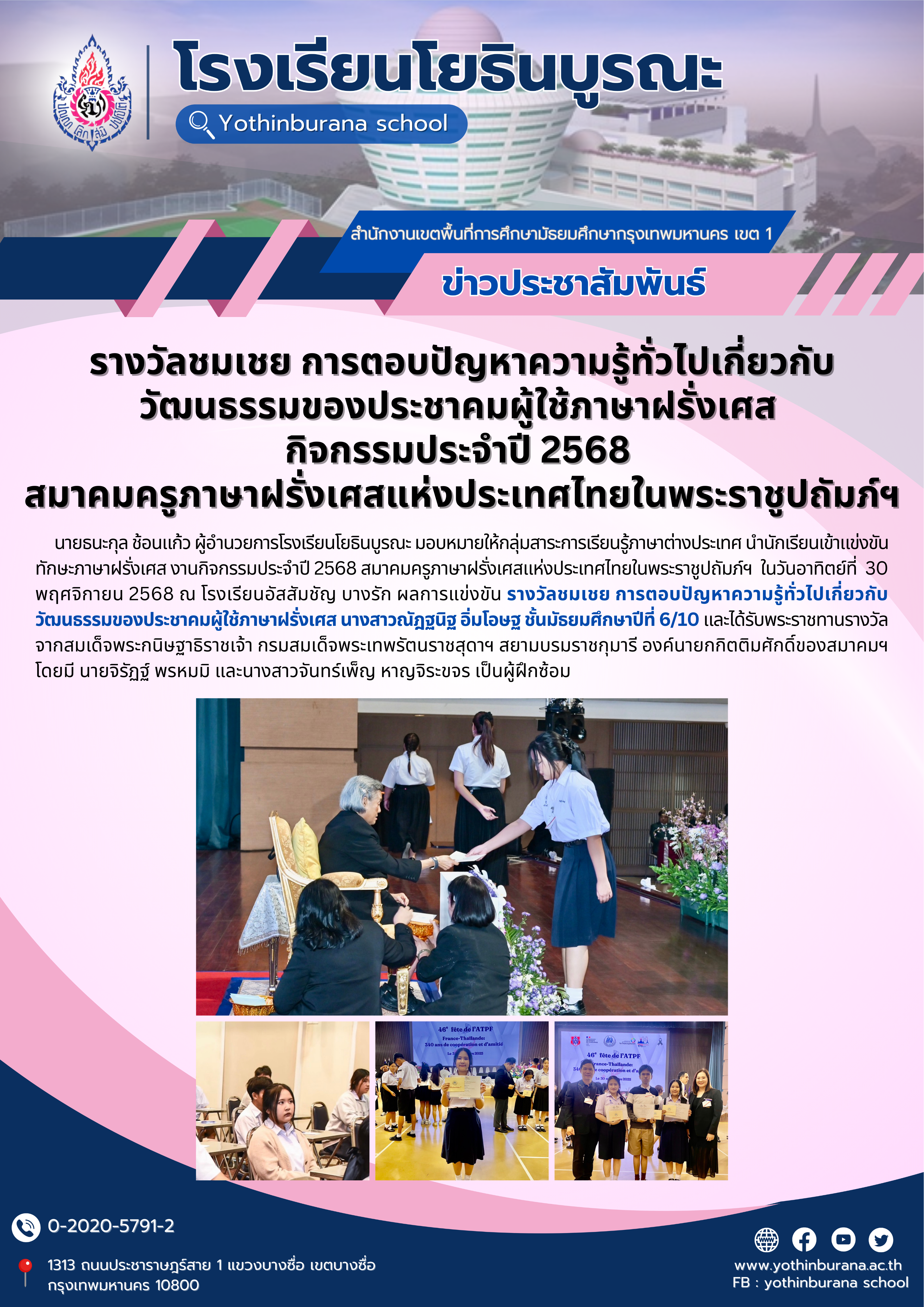 นายธนะกุล ช้อนแก้ว ผู้อำนวยการโรงเรียนโยธินบูรณะ มอบหมายให้กลุ่มสาระการเรียนรู้ภาษาต่างประเทศ นำนักเรียนเข้าแข่งขันทักษะภาษาฝรั่งเศส งานกิจกรรมประจำปี 2568 สมาคมครูภาษาฝรั่งเศสแห่งประเทศไทยในพระราชูปถัมภ์ฯ ในวันอาทิตย์ที่ 30 พฤศจิกายน 2568 ณ โรงเรียนอัสสัมชัญ บางรัก