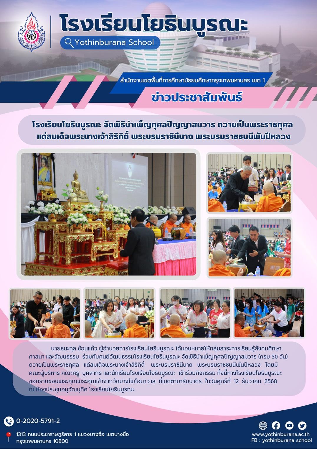 นายธนะกุล ช้อนแก้ว ผู้อำนวยการโรงเรียนโยธินบูรณะ ได้มอบหมายให้กลุ่มสาระการเรียนรู้สังคมศึกษา ศาสนา และวัฒนธรรม ร่วมกับศูนย์วัฒนธรรมโรงเรียนโยธินบูรณะ จัดพิธีบำเพ็ญกุศลปัญญาสมวาร (ครบ 50 วัน) ถวายเป็นพระราชกุศล แด่สมเด็จพระนางเจ้าสิริกิติ์ พระบรมราชินีนาถ พระบรมราชชนนีพันปีหลวง โดยมีคณะผู้บริหาร คณะครู บุคลากร นักเรียน และองค์กรที่เกี่ยวข้องกับโรงเรียนโยธินบูรณะ เข้าร่วมกิจกรรม ทั้งนี้ทางโรงเรียนโยธินบูรณะ ขอกราบขอบพระคุณพระคุณเจ้าจากวัดบางโพโอมาวาส ที่เมตตามารับบาตร ในวันศุกร์ที่ 12 ธันวาคม 2568 ณ ห้องประชุมอนุวัฒนุทิศ โรงเรียนโยธินบูรณะ