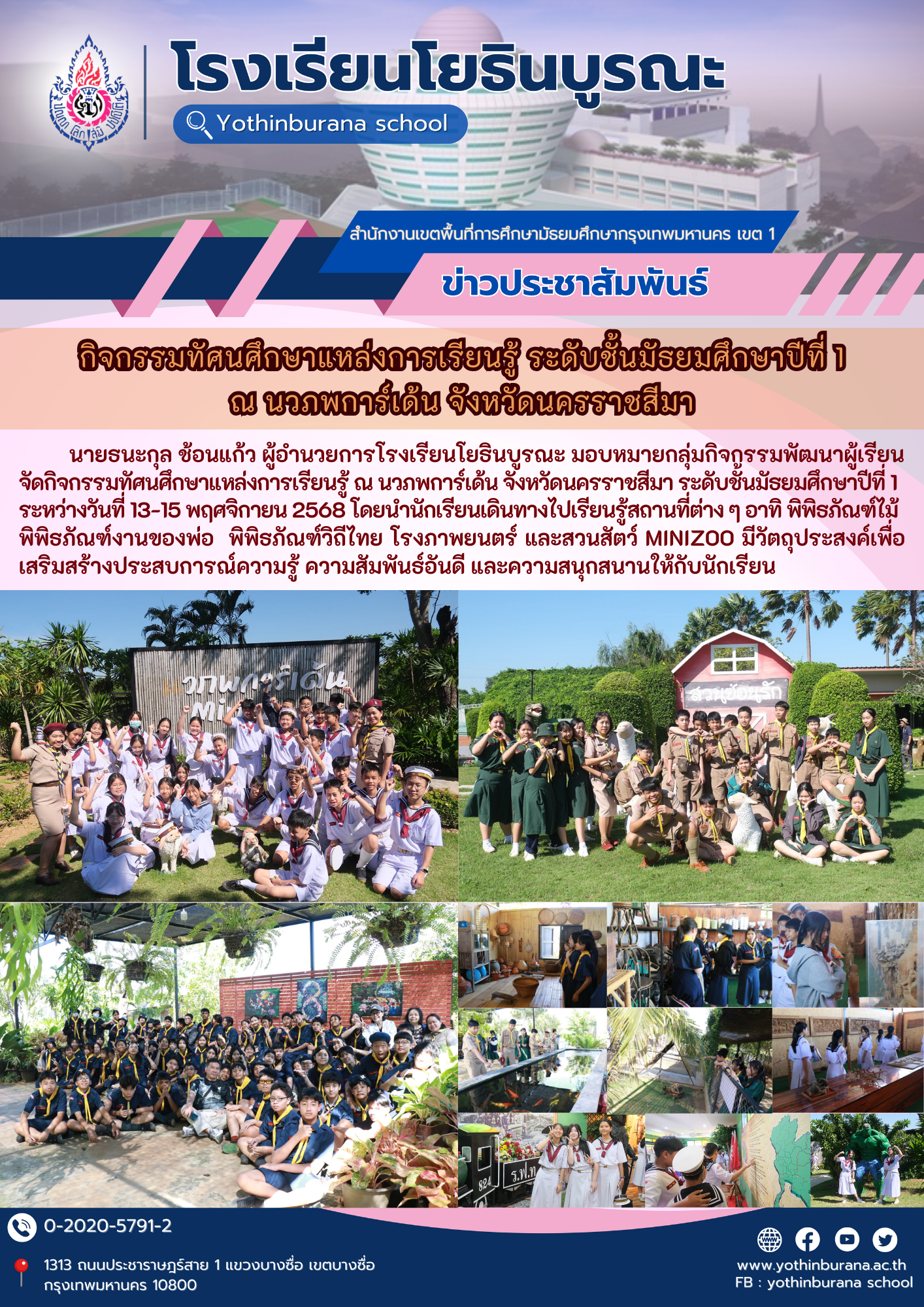 นายธนะกุล ช้อนแก้ว ผู้อำนวยการโรงเรียนโยธินบูรณะ มอบหมายกลุ่มกิจกรรมพัฒนาผู้เรียน จัดกิจกรรมทัศนศึกษาแหล่งการเรียนรู้ ณ นวภพการ์เด้น จังหวัดนครราชสีมา ระดับชั้นมัธยมศึกษาปีที่ 1 ระหว่างวันที่ 13-15 พฤศจิกายน 2568 โดยนำนักเรียนเดินทางไปเรียนรู้สถานที่ต่าง ๆ อาทิ พิพิธภัณฑ์ไม้ พิพิธภัณฑ์งานของพ่อ พิพิธภัณฑ์วิถีไทย โรงภาพยนตร์ และสวนสัตว์ Minizoo มีวัตถุประสงค์เพื่อเสริมสร้างประสบการณ์ความรู้ ความสัมพันธ์อันดี และความสนุกสนานให้กับนักเรียน