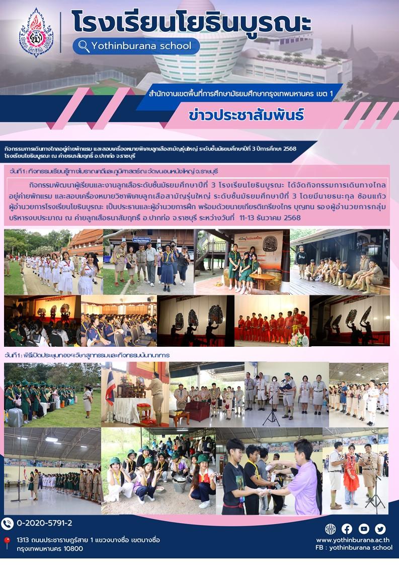 กิจกรรมพัฒนาผู้เรียนและงานลูกเสือระดับชั้นมัธยมศึกษาปีที่ 3 โรงเรียนโยธินบูรณะ ได้จัดกิจกรรมการเดินทางไกล อยู่ค่ายพักแรม และสอบเครื่องหมายวิชาพิเศษลูกเสือสามัญรุ่นใหญ่ ระดับชั้นมัธยมศึกษาปีที่ 3 โดยมีนายธนะกุล ช้อนแก้ว ผู้อำนวยการโรงเรียนโยธินบูรณะ เป็นประธานและผู้อำนวยการฝึก พร้อมด้วยนายเกียรติเกรียงไกร บุญทน รองผู้อำนวยการกลุ่มบริหารงบประมาณ ณ ค่ายลูกเสือธนาสัมฤทธิ์ อ.ปากท่อ จ.ราชบุรี ระหว่างวันที่ 11-13 ธันวาคม 2568