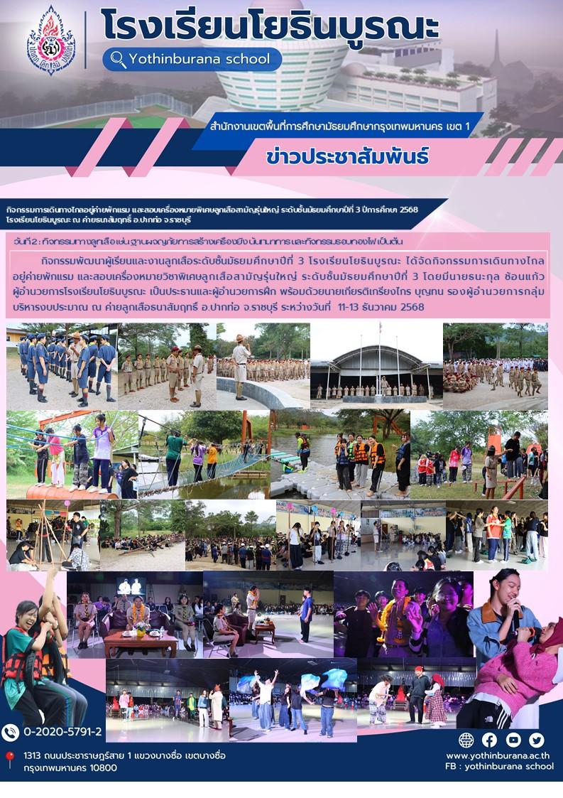 กิจกรรมพัฒนาผู้เรียนและงานลูกเสือระดับชั้นมัธยมศึกษาปีที่ 3 โรงเรียนโยธินบูรณะ ได้จัดกิจกรรมการเดินทางไกล อยู่ค่ายพักแรม และสอบเครื่องหมายวิชาพิเศษลูกเสือสามัญรุ่นใหญ่ ระดับชั้นมัธยมศึกษาปีที่ 3 โดยมีนายธนะกุล ช้อนแก้ว ผู้อำนวยการโรงเรียนโยธินบูรณะ เป็นประธานและผู้อำนวยการฝึก พร้อมด้วยนายเกียรติเกรียงไกร บุญทน รองผู้อำนวยการกลุ่มบริหารงบประมาณ ณ ค่ายลูกเสือธนาสัมฤทธิ์ อ.ปากท่อ จ.ราชบุรี ระหว่างวันที่ 11-13 ธันวาคม 2568