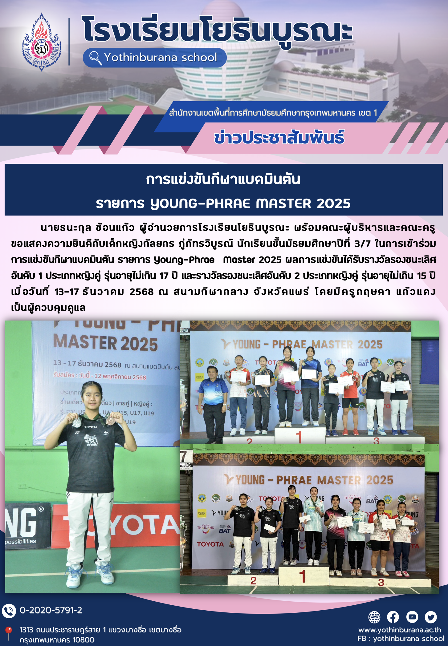 นายธนะกุล ช้อนแก้ว ผู้อำนวยการโรงเรียนโยธินบูรณะ พร้อมคณะผู้บริหารและคณะครู ขอแสดงความยินดีกับเด็กหญิงกัลยกร ภู่ภัทรวิบูรณ์ นักเรียนชั้นมัธยมศึกษาปีที่ 3/7 ในการเข้าร่วมการแข่งขันกีฬาแบดมินตัน รายการ Young-Phrae Master 2025 ผลการแข่งขันได้รับรางวัลรองชนะเลิศอันดับ 1 ประเภทหญิงคู่ รุ่นอายุไม่เกิน 17 ปี และรางวัลรองชนะเลิศอันดับ 2 ประเภทหญิงคู่ รุ่นอายุไม่เกิน 15 ปี เมื่อวันที่ 13-17 ธันวาคม 2568 ณ สนามกีฬากลาง จังหวัดแพร่ โดยมีครูกฤษดา แก้วแดง เป็นผู้ควบคุมดูแล