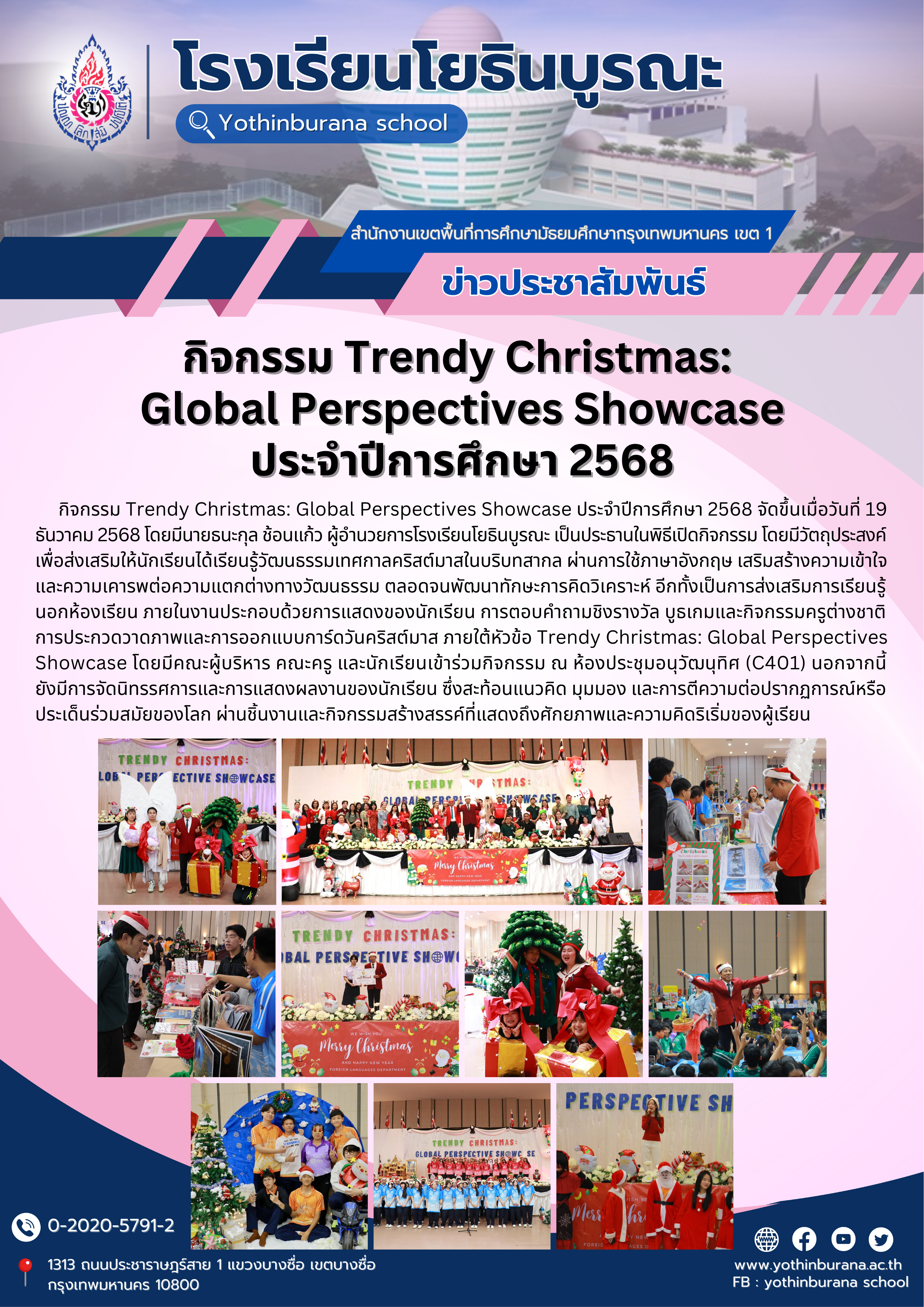 กิจกรรม Trendy Christmas: Global Perspectives Showcase ประจำปีการศึกษา 2568 จัดขึ้นเมื่อวันที่ 19 ธันวาคม 2568 โดยมีนายธนะกุล ช้อนแก้ว ผู้อำนวยการโรงเรียนโยธินบูรณะ เป็นประธานในพิธีเปิดกิจกรรม โดยมีวัตถุประสงค์เพื่อส่งเสริมให้นักเรียนได้เรียนรู้วัฒนธรรมเทศกาลคริสต์มาสในบริบทสากล ผ่านการใช้ภาษาอังกฤษ เสริมสร้างความเข้าใจและความเคารพต่อความแตกต่างทางวัฒนธรรม ตลอดจนพัฒนาทักษะการคิดวิเคราะห์ อีกทั้งเป็นการส่งเสริมการเรียนรู้นอกห้องเรียน ภายในงานประกอบด้วยการแสดงของนักเรียน การตอบคำถามชิงรางวัล บูธเกมและกิจกรรมครูต่างชาติ การประกวดวาดภาพและการออกแบบการ์ดวันคริสต์มาส ภายใต้หัวข้อ Trendy Christmas: Global Perspectives Showcase โดยมีคณะผู้บริหาร คณะครู และนักเรียนเข้าร่วมกิจกรรม ณ ห้องประชุมอนุวัฒนุทิศ (C401)