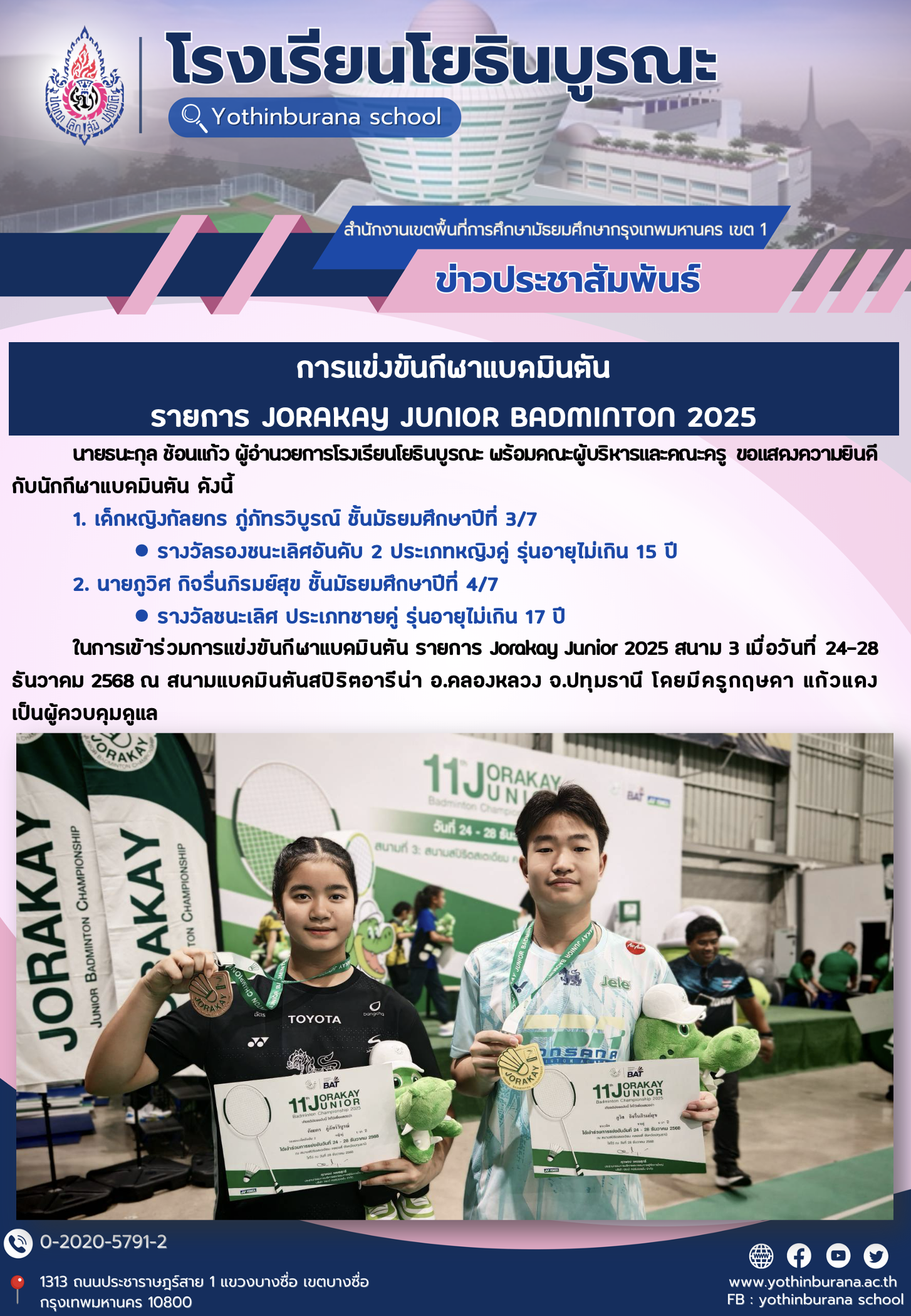 ในการเข้าร่วมการแข่งขันกีฬาแบดมินตัน รายการ Jorakay Junior 2025 สนาม 3 เมื่อวันที่ 24-28 ธันวาคม 2568 ณ สนามแบดมินตันสปิริตอารีน่า อ.คลองหลวง จ.ปทุมธานี โดยมีครูกฤษดา แก้วแดง เป็นผู้ควบคุมดูแล