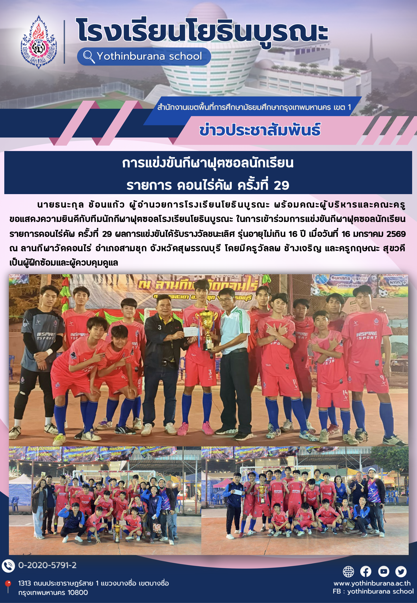 นายธนะกุล ช้อนแก้ว ผู้อำนวยการโรงเรียนโยธินบูรณะ พร้อมคณะผู้บริหารและคณะครู ขอแสดงความยินดีกับทีมนักกีฬาฟุตซอลโรงเรียนโยธินบูรณะ ในการเข้าร่วมการแข่งขันกีฬาฟุตซอลนักเรียนรายการดอนไร่คัพ ครั้งที่ 29 ผลการแข่งขันได้รับรางวัลชนะเลิศ รุ่นอายุไม่เกิน 16 ปี เมื่อวันที่ 16 มกราคม 2569 ณ ลานกีฬาวัดดอนไร่ อำเภอสามชุก จังหวัดสุพรรณบุรี โดยมีครูวัลลพ ช้างเจริญ และครูกฤษณะ สุขวดี เป็นผู้ฝึกซ้อมและผู้ควบคุมดูแล