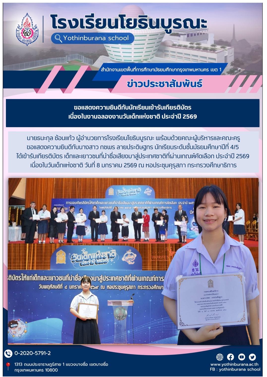 แสดงความยินดีกับนางสาว กชพร ลายประดิษฐกร นักเรียนระดับชั้นมัธยมศึกษาปีที่ 4/5 ได้เข้ารับเกียรติบัตร เด็กและเยาวชนที่นำชื่อเสียงมาสู่ประเทศชาติที่ผ่านเกณฑ์คัดเลือก ประจำปี 2569 เนื่องในวันเด็กแห่งชาต