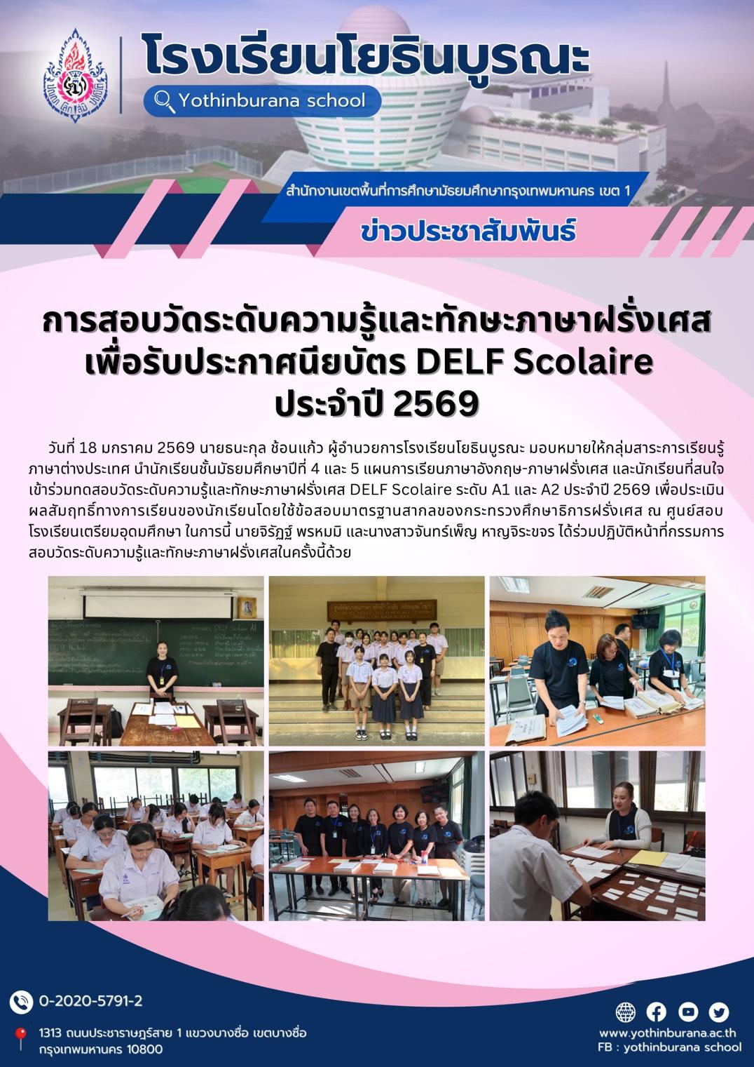 วันที่ 18 มกราคม 2569 นายธนะกุล ช้อนแก้ว ผู้อำนวยการโรงเรียนโยธินบูรณะ มอบหมายให้กลุ่มสาระการเรียนรู้ภาษาต่างประเทศ นำนักเรียนชั้นมัธยมศึกษาปีที่ 4 และ 5 แผนการเรียนภาษาอังกฤษ-ภาษาฝรั่งเศส และนักเรียนที่สนใจ เข้าร่วมทดสอบวัดระดับความรู้และทักษะภาษาฝรั่งเศส DELF Scolaire ระดับ A1 และ A2 ประจำปี 2569 เพื่อประเมินผลสัมฤทธิ์ทางการเรียนของนักเรียนโดยใช้ข้อสอบมาตรฐานสากลของกระทรวงศึกษาธิการฝรั่งเศส ณ ศูนย์สอบโรงเรียนเตรียมอุดมศึกษา ในการนี้ นายจิรัฏฐ์ พรหมมิ และนางสาวจันทร์เพ็ญ หาญจิระขจร ได้ร่วมปฏิบัติหน้าที่กรรมการสอบวัดระดับความรู้และทักษะภาษาฝรั่งเศสในครั้งนี้ด้วย
