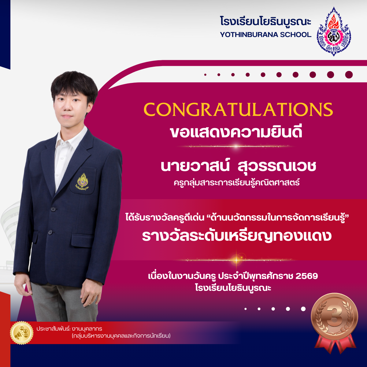 แสดงความยินดีกับคุณครูที่ได้รับรางวัลครูดีเด่น "ด้านนวัตกรรมในการจัดการเรียนรู้ เนื่องในงานวันครู ประจำปีพุทธศักราช 2569