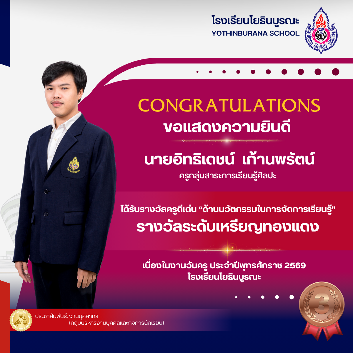 แสดงความยินดีกับคุณครูที่ได้รับรางวัลครูดีเด่น "ด้านนวัตกรรมในการจัดการเรียนรู้ เนื่องในงานวันครู ประจำปีพุทธศักราช 2569 ดังนี้