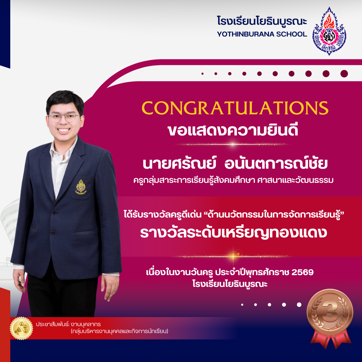 แสดงความยินดีกับคุณครูที่ได้รับรางวัลครูดีเด่น "ด้านนวัตกรรมในการจัดการเรียนรู้ เนื่องในงานวันครู ประจำปีพุทธศักราช 2569