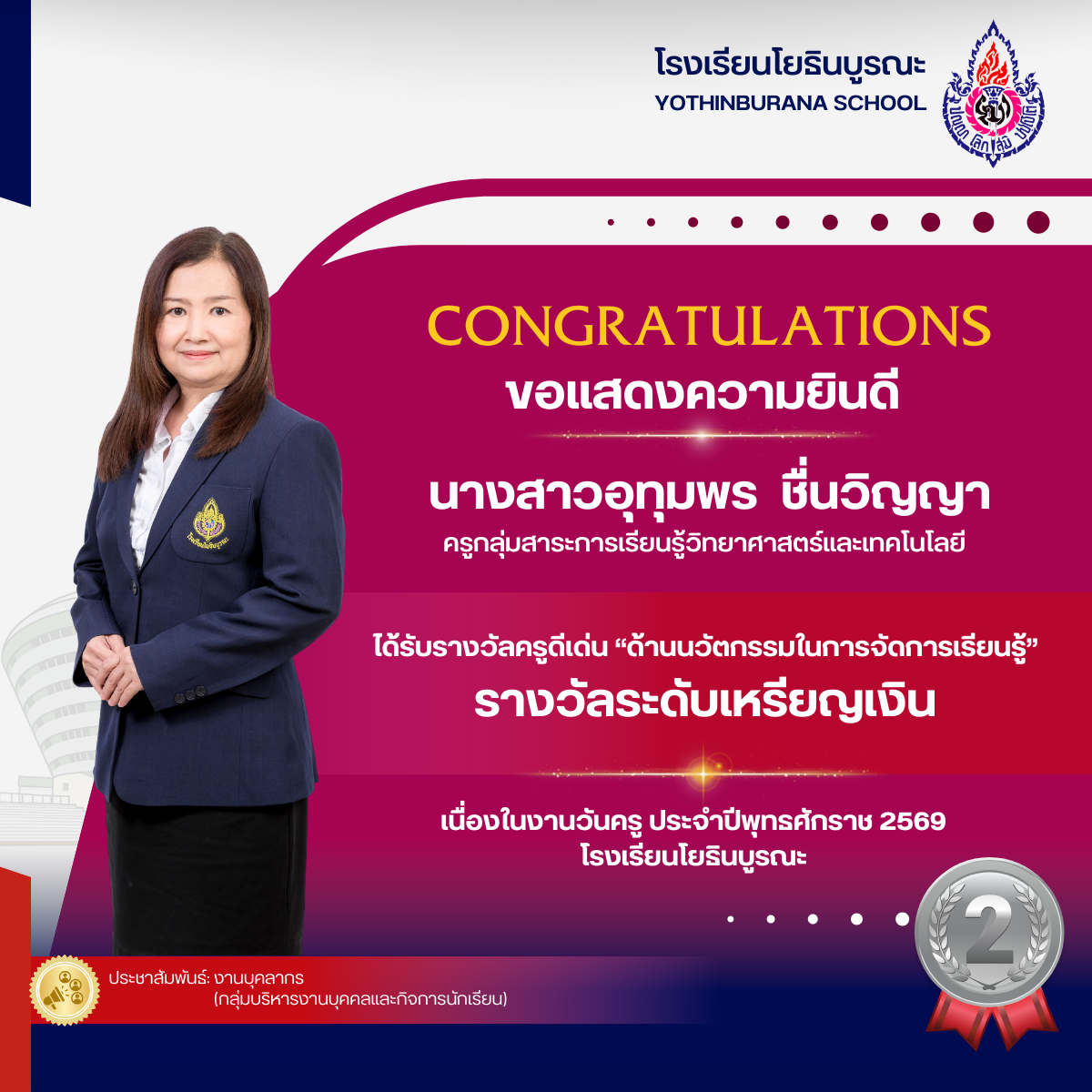 แสดงความยินดีกับคุณครูที่ได้รับรางวัลครูดีเด่น "ด้านนวัตกรรมในการจัดการเรียนรู้ เนื่องในงานวันครู ประจำปีพุทธศักราช 2569 ดังนี้