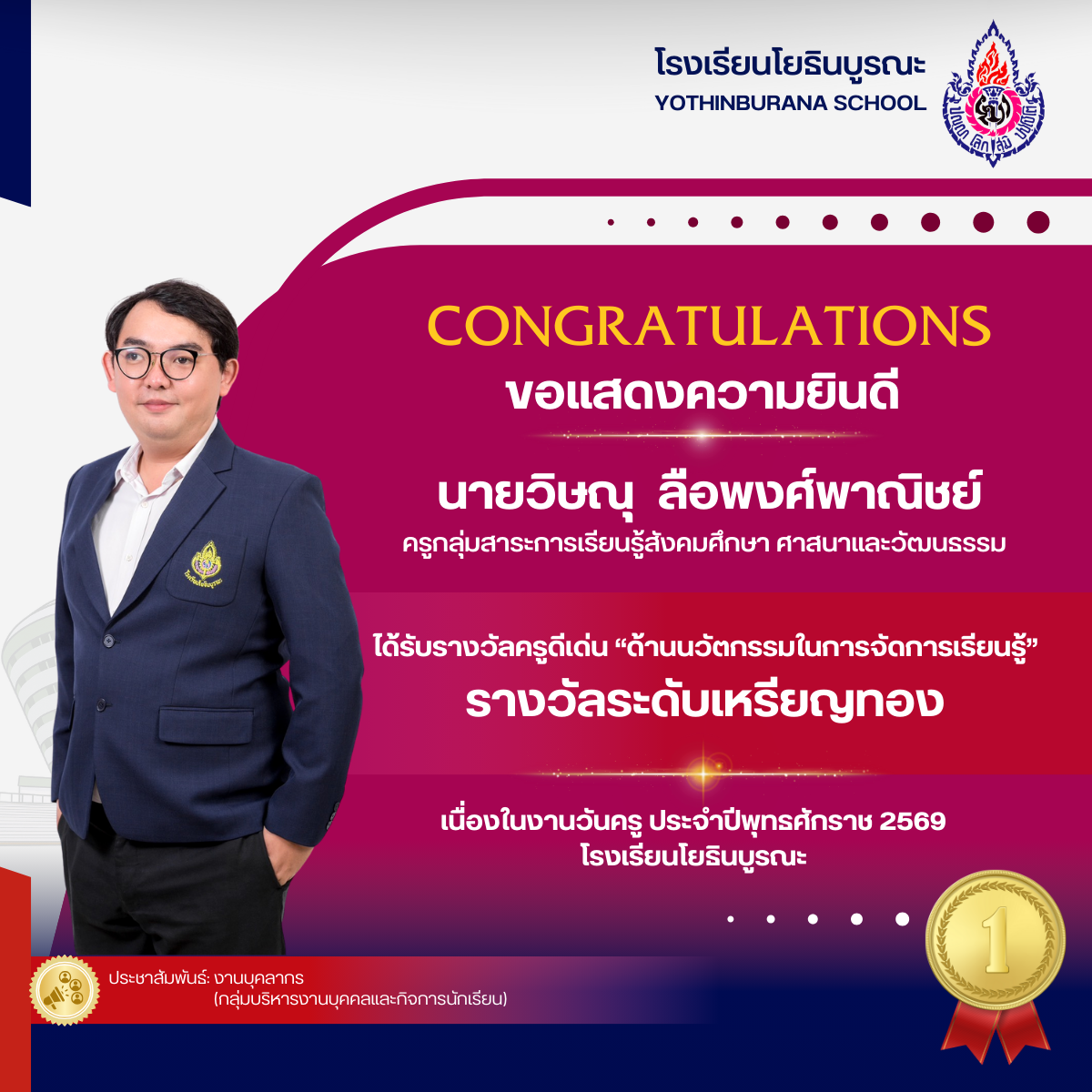 แสดงความยินดีกับคุณครูที่ได้รับรางวัลครูดีเด่น "ด้านนวัตกรรมในการจัดการเรียนรู้ เนื่องในงานวันครู ประจำปีพุทธศักราช 2569 ดังนี้