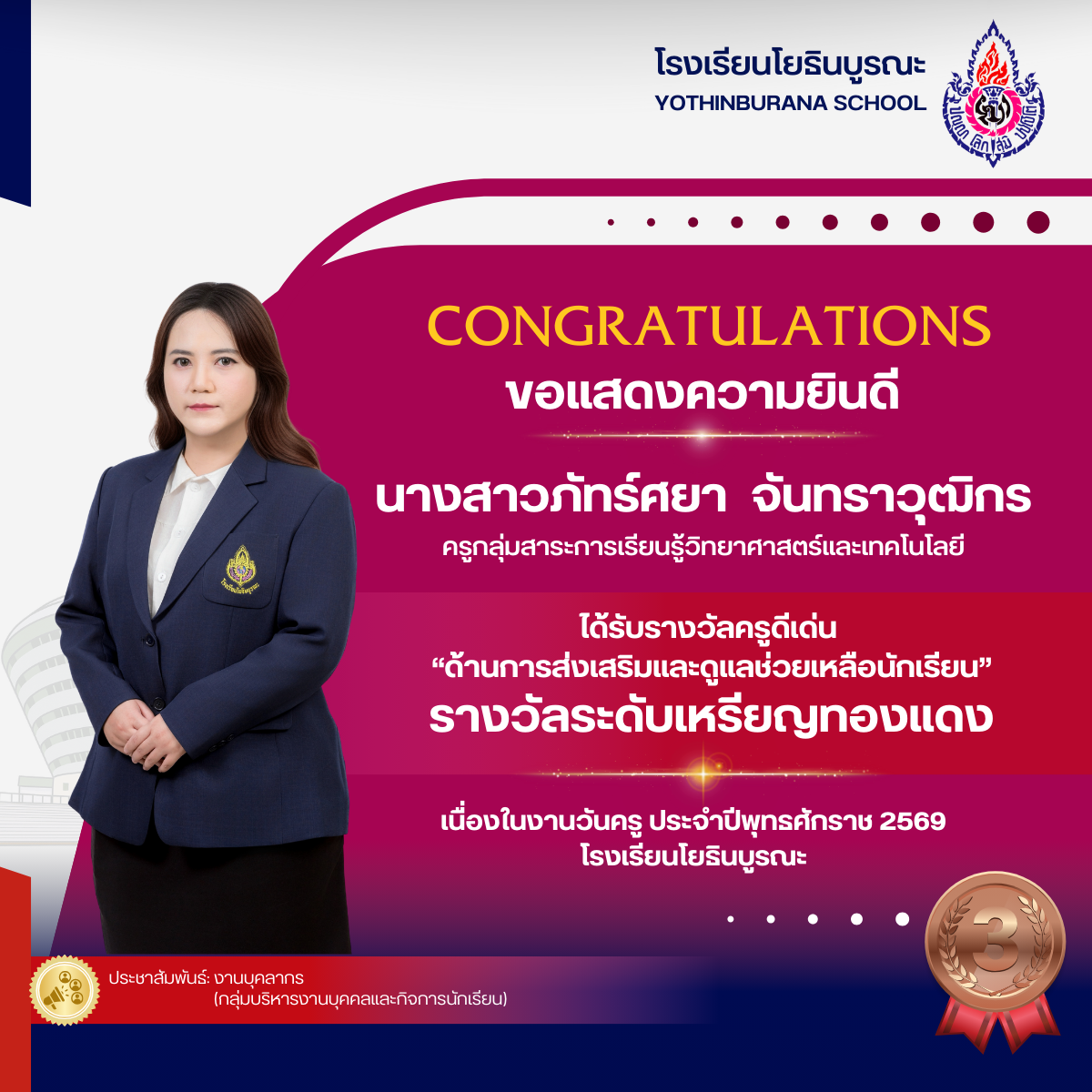 แสดงความยินดีกับคุณครูที่ได้รับรางวัลครูดีเด่น "ด้านการส่งเสริมและดูแลช่วยเหลือนักเรียน เนื่องในงานวันครู ประจำปีพุทธศักราช 2569