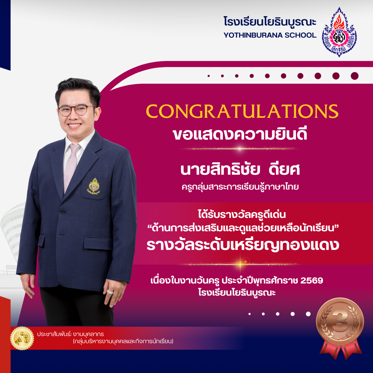 แสดงความยินดีกับคุณครูที่ได้รับรางวัลครูดีเด่น "ด้านการส่งเสริมและดูแลช่วยเหลือนักเรียน เนื่องในงานวันครู ประจำปีพุทธศักราช 2569 ดังนี้