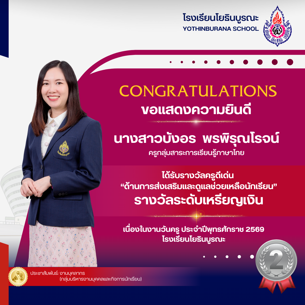 แสดงความยินดีกับคุณครูที่ได้รับรางวัลครูดีเด่น "ด้านการส่งเสริมและดูแลช่วยเหลือนักเรียน เนื่องในงานวันครู ประจำปีพุทธศักราช 2569