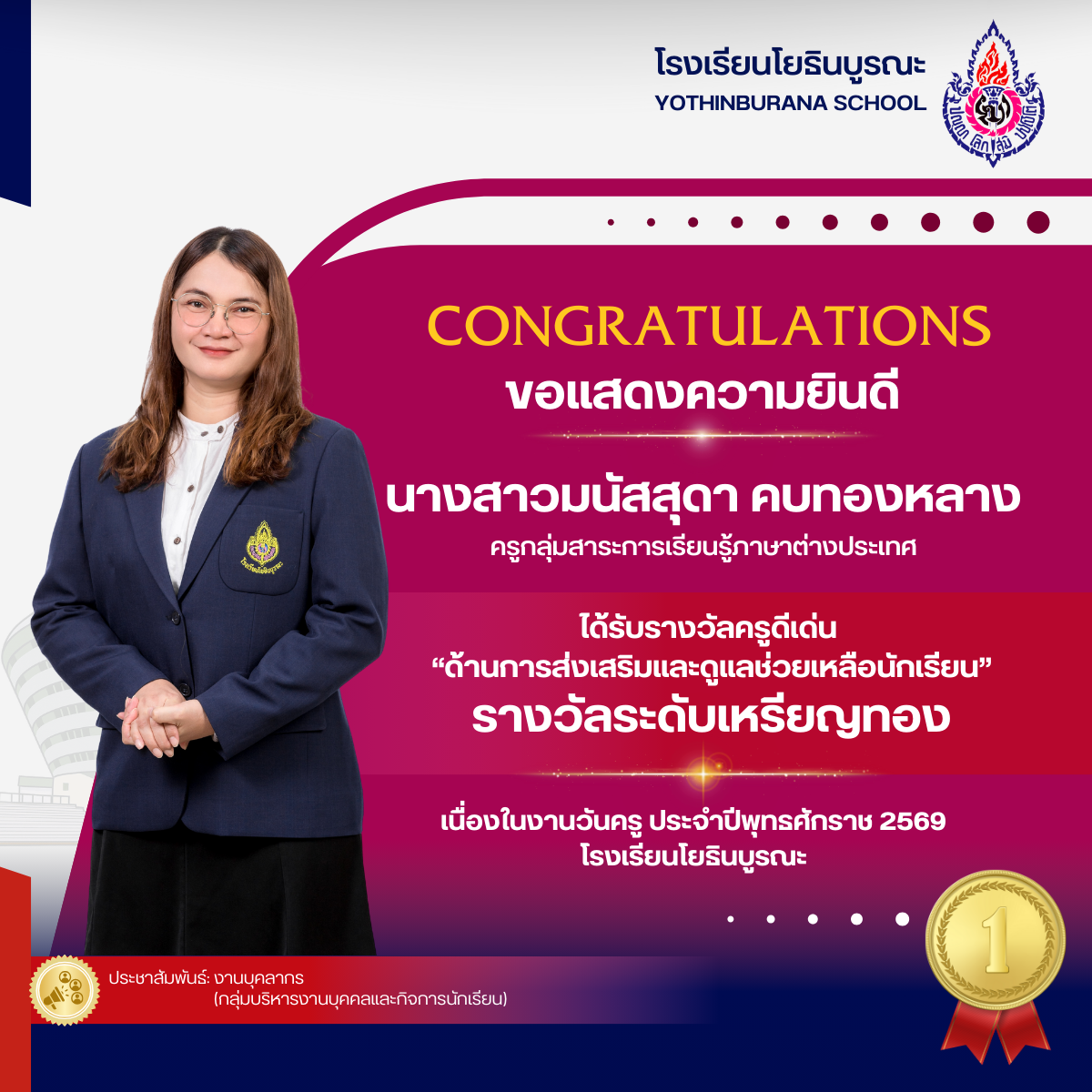 แสดงความยินดีกับคุณครูที่ได้รับรางวัลครูดีเด่น "ด้านการส่งเสริมและดูแลช่วยเหลือนักเรียน เนื่องในงานวันครู ประจำปีพุทธศักราช 2569