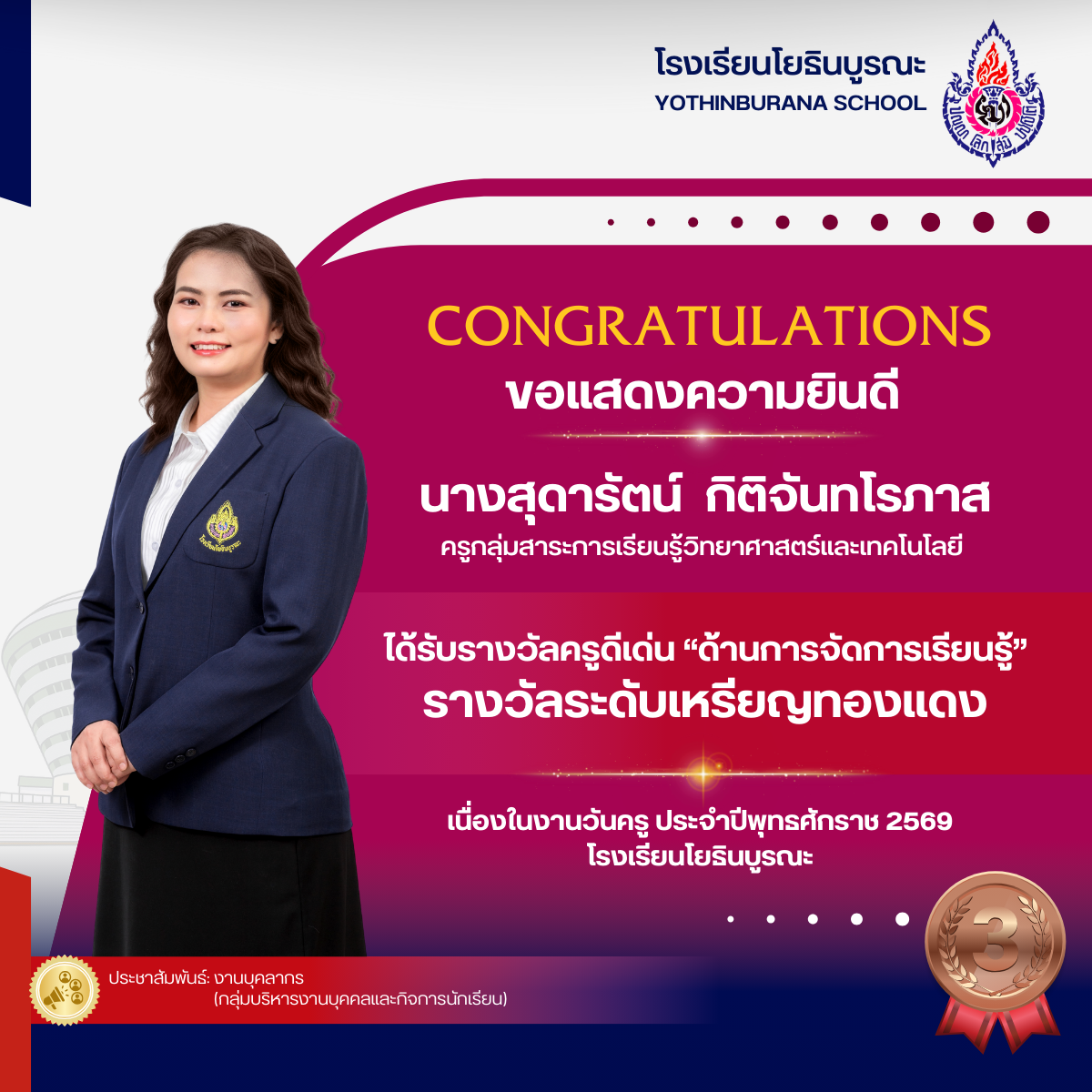 แสดงความยินดีกับคุณครูที่ได้รับรางวัลครูดีเด่น "ด้านการจัดการเรียนรู้ เนื่องในงานวันครู ประจำปีพุทธศักราช 2569