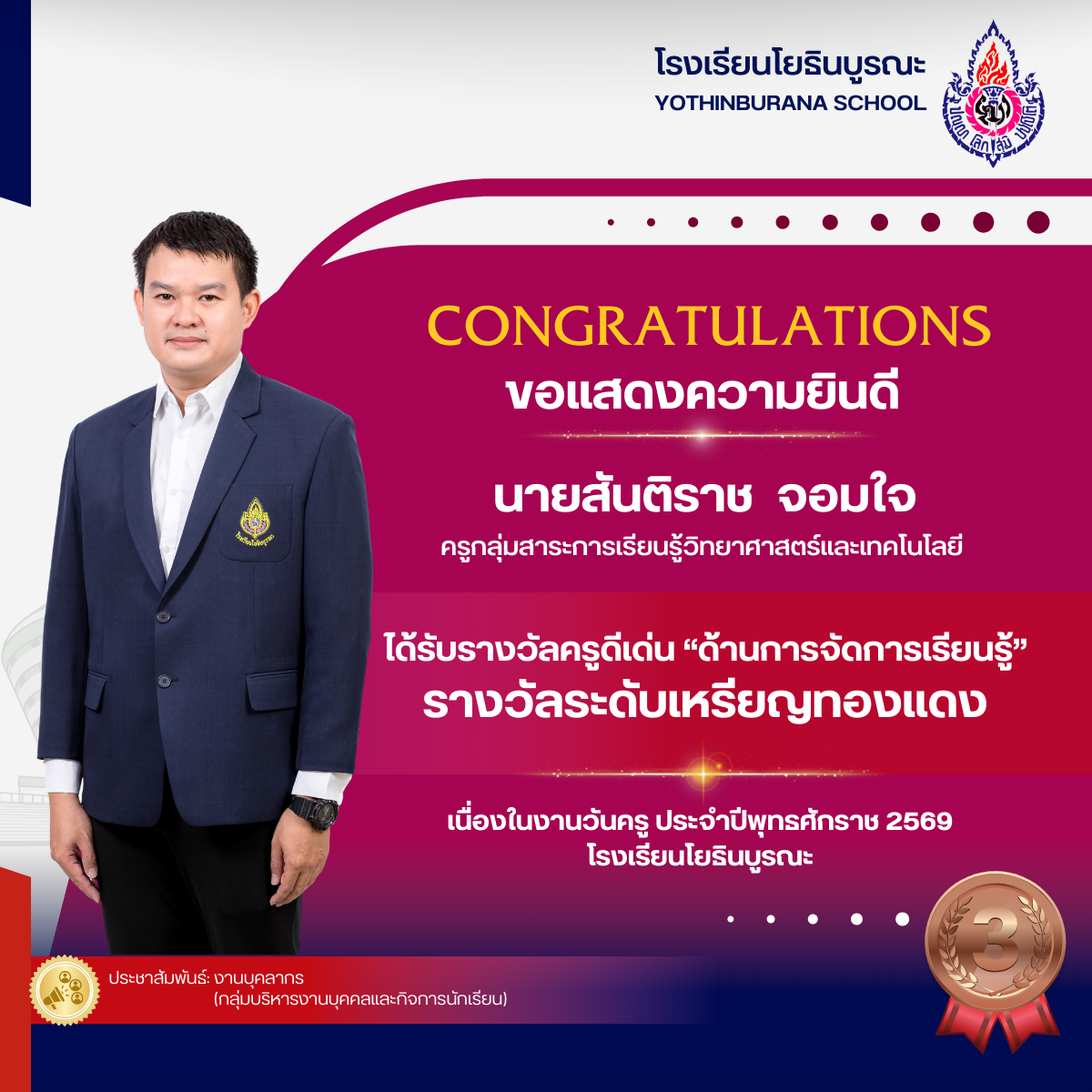 แสดงความยินดีกับคุณครูที่ได้รับรางวัลครูดีเด่น "ด้านการจัดการเรียนรู้ เนื่องในงานวันครู ประจำปีพุทธศักราช 2569
