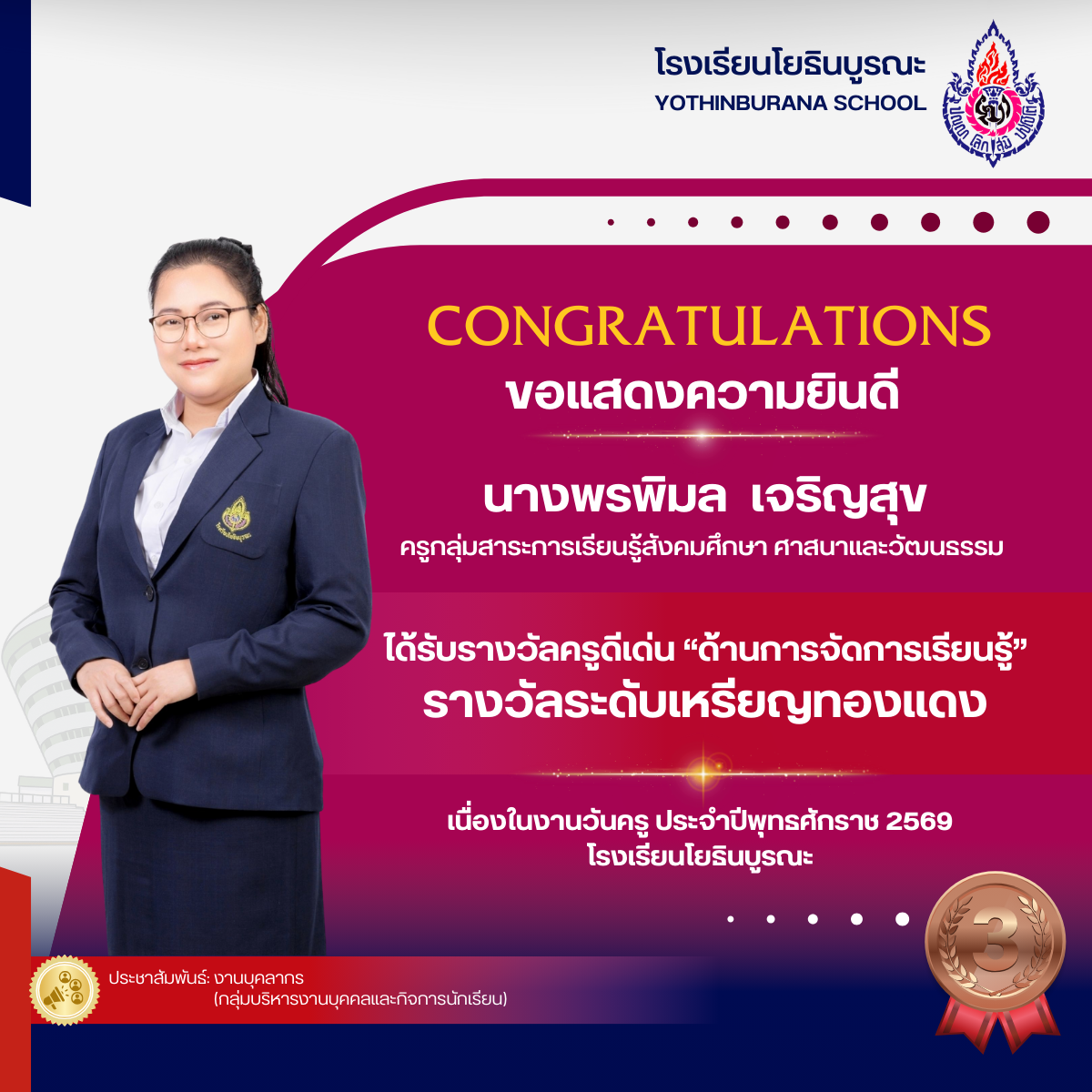 แสดงความยินดีกับคุณครูที่ได้รับรางวัลครูดีเด่น "ด้านการจัดการเรียนรู้ เนื่องในงานวันครู ประจำปีพุทธศักราช 2569