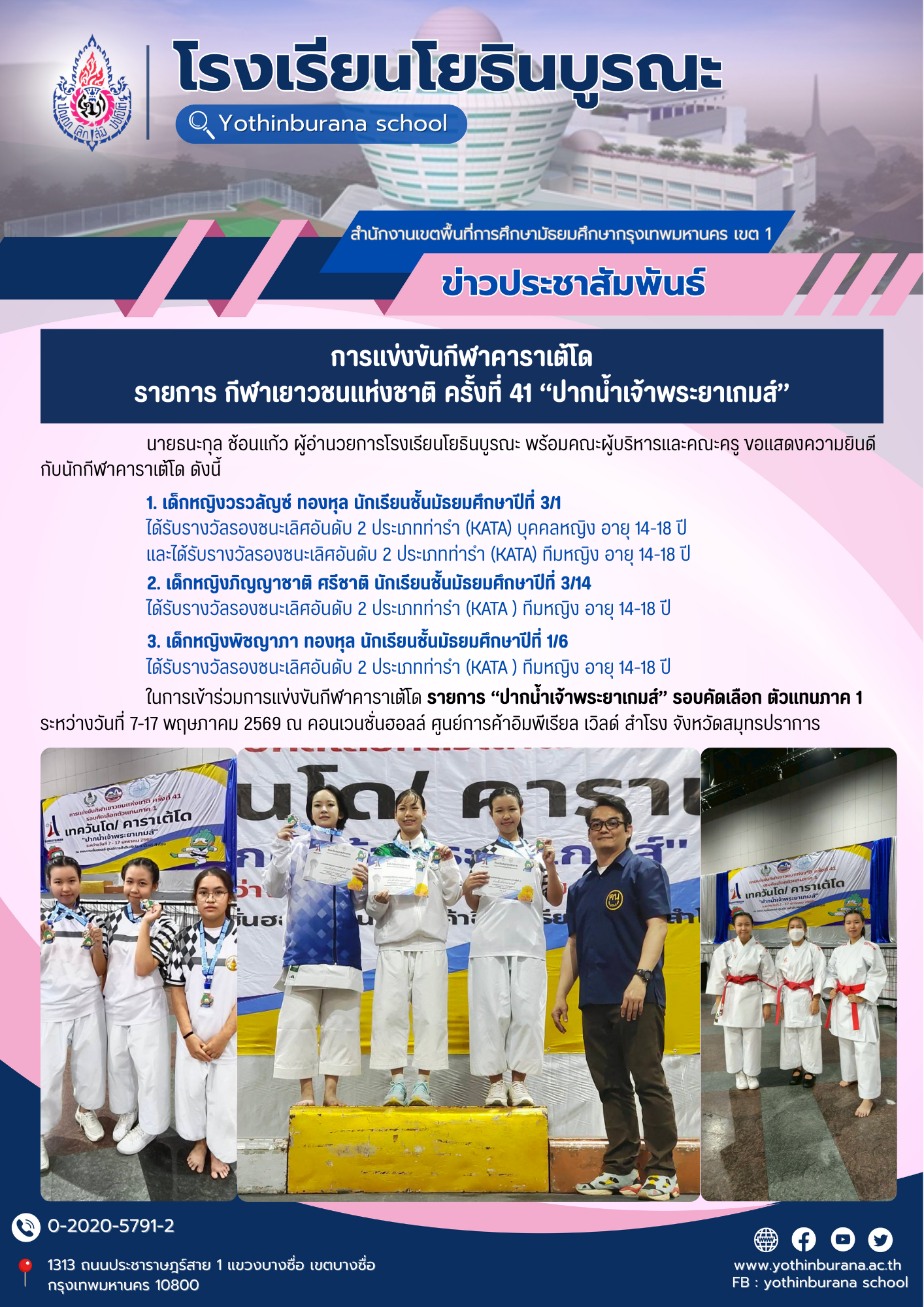 นายธนะกุล ช้อนแก้ว ผู้อำนวยการโรงเรียนโยธินบูรณะ พร้อมคณะผู้บริหารและคณะครู ขอแสดงความยินดีกับนักกีฬาคาราเต้โด ดังนี้