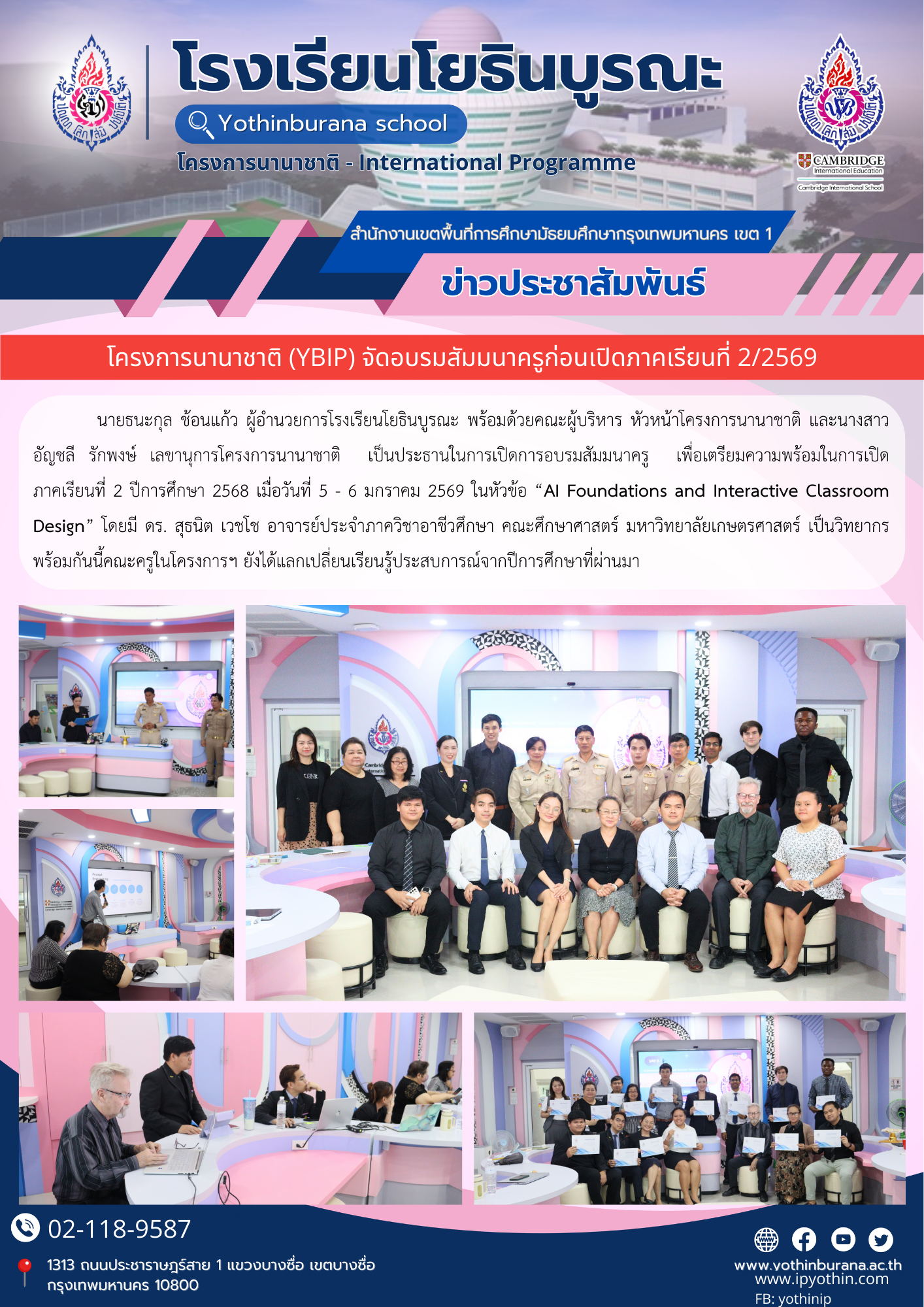 นายธนะกุล ช้อนแก้ว ผู้อำนวยการโรงเรียนโยธินบูรณะ พร้อมด้วยคณะผู้บริหาร หัวหน้าโครงการนานาชาติ และนางสาวอัญชลี รักพงษ์ เลขานุการโครงการนานาชาติ เป็นประธานในการเปิดการอบรมสัมมนาครู เพื่อเตรียมความพร้อมในการเปิด ภาคเรียนที่ 2 ปีการศึกษา 2568 เมื่อวันที่ 5 - 6 มกราคม 2569 ในหัวข้อ AI Foundations and Interactive Classroom Design โดยมี ดร. สุธนิต เวชโช อาจารย์ประจำภาควิชาอาชีวศึกษา คณะศึกษาศาสตร์ มหาวิทยาลัยเกษตรศาสตร์ เป็นวิทยากร พร้อมกันนี้คณะครูในโครงการฯ ยังได้แลกเปลี่ยนเรียนรู้ประสบการณ์จากปีการศึกษาที่ผ่านมา