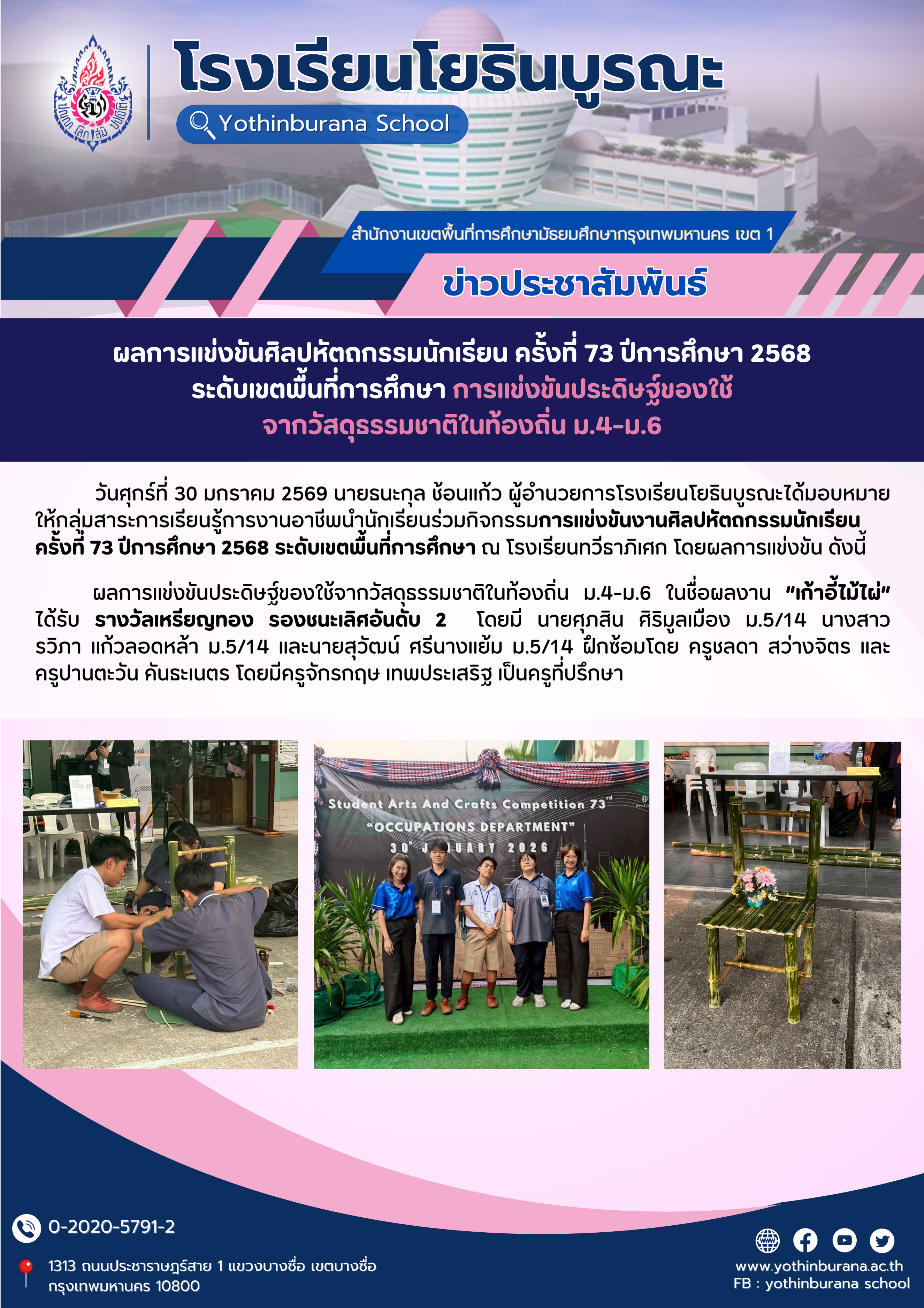รางวัลเหรียญทอง การแข่งขันประดิษฐ์ของใช้จากวัสดุธรรมชาติในท้องถิ่น ม.4-ม.6 ในชื่อผลงาน เก้าอี้ไม้ไผ่