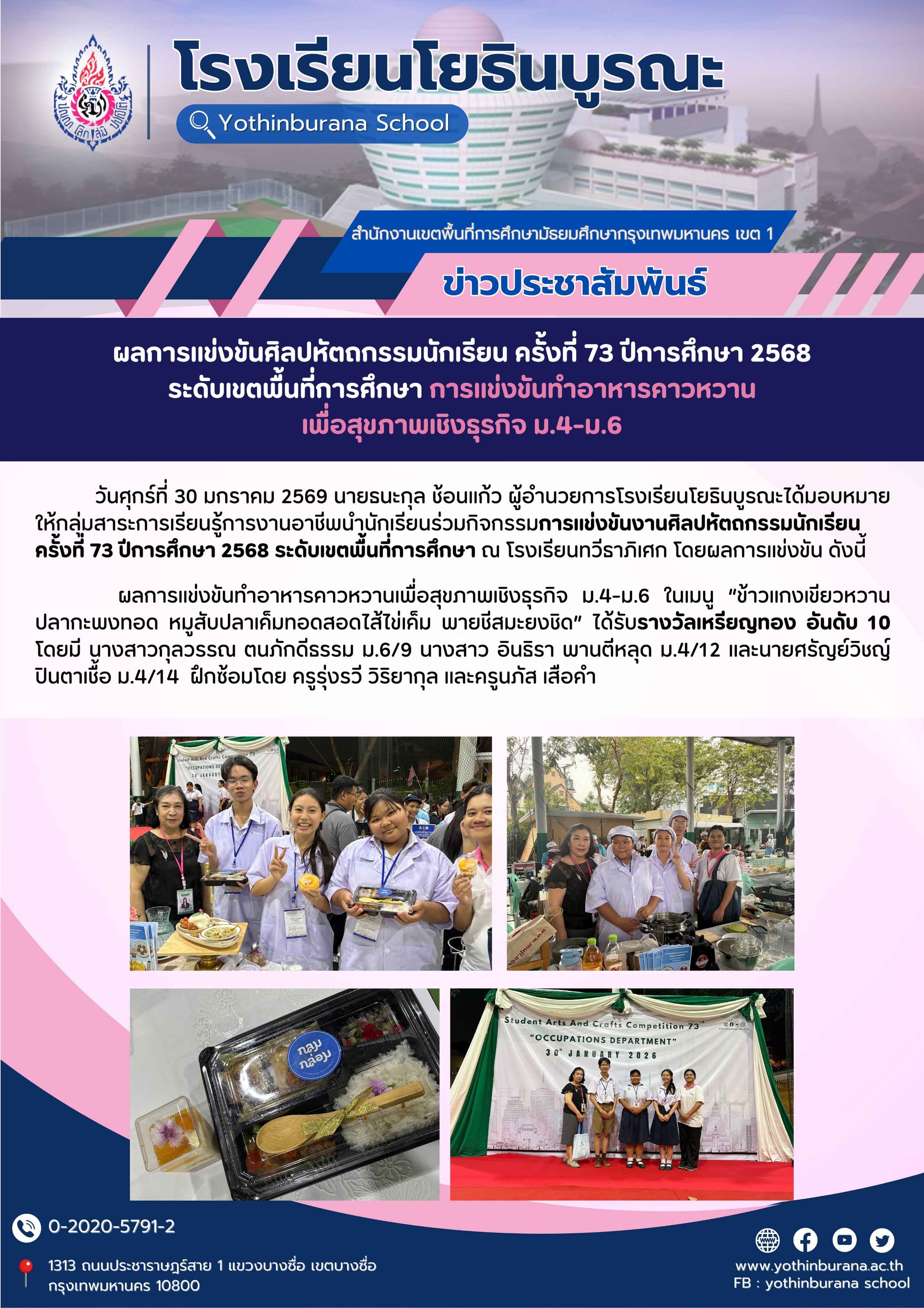 การแข่งขันทำอาหารคาวหวานเพื่อสุขภาพเชิงธุรกิจ ม.4-ม.6 เมนู ข้าวแกงเขียวหวานปลากะพงทอด หมูสับปลาเค็มทอดสอดไส้ไข่เค็ม พายชีสมะยงชิด ได้รับรางวัลเหรียญทอง อันดับ 10 โดยมี นางสาวกุลวรรณ ตนภักดีธรรม ม.6/9 นางสาว อินธิรา พานตีหลุด ม.4/12 และนายศรัญย์วิชญ์ ปินตาเชื้อ ม.4/14 ฝึกซ้อมโดย ครูรุ่งรวี วิริยากุล และครูนภัส เสือคำ