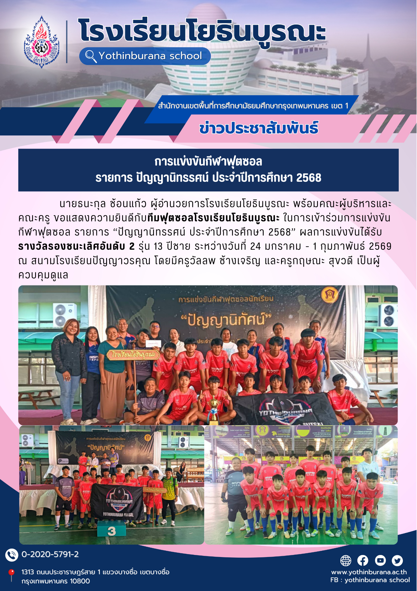 นายธนะกุล ช้อนแก้ว ผู้อำนวยการโรงเรียนโยธินบูรณะ พร้อมคณะผู้บริหารและคณะครู ขอแสดงความยินดีกับทีมฟุตซอลโรงเรียนโยธินบูรณะ ในการเข้าร่วมการแข่งขันกีฬาฟุตซอล รายการ ปัญญานิทรรศน์ ประจำปีการศึกษา 2568 ผลการแข่งขันได้รับรางวัลรองชนะเลิศอันดับ 2 รุ่น 13 ปีชาย ระหว่างวันที่ 24 มกราคม - 1 กุมภาพันธ์ 2569 ณ สนามโรงเรียนปัญญาวรคุณ โดยมีครูวัลลพ ช้างเจริญ และครูกฤษณะ สุขวดี เป็นผู้ควบคุมดูแล