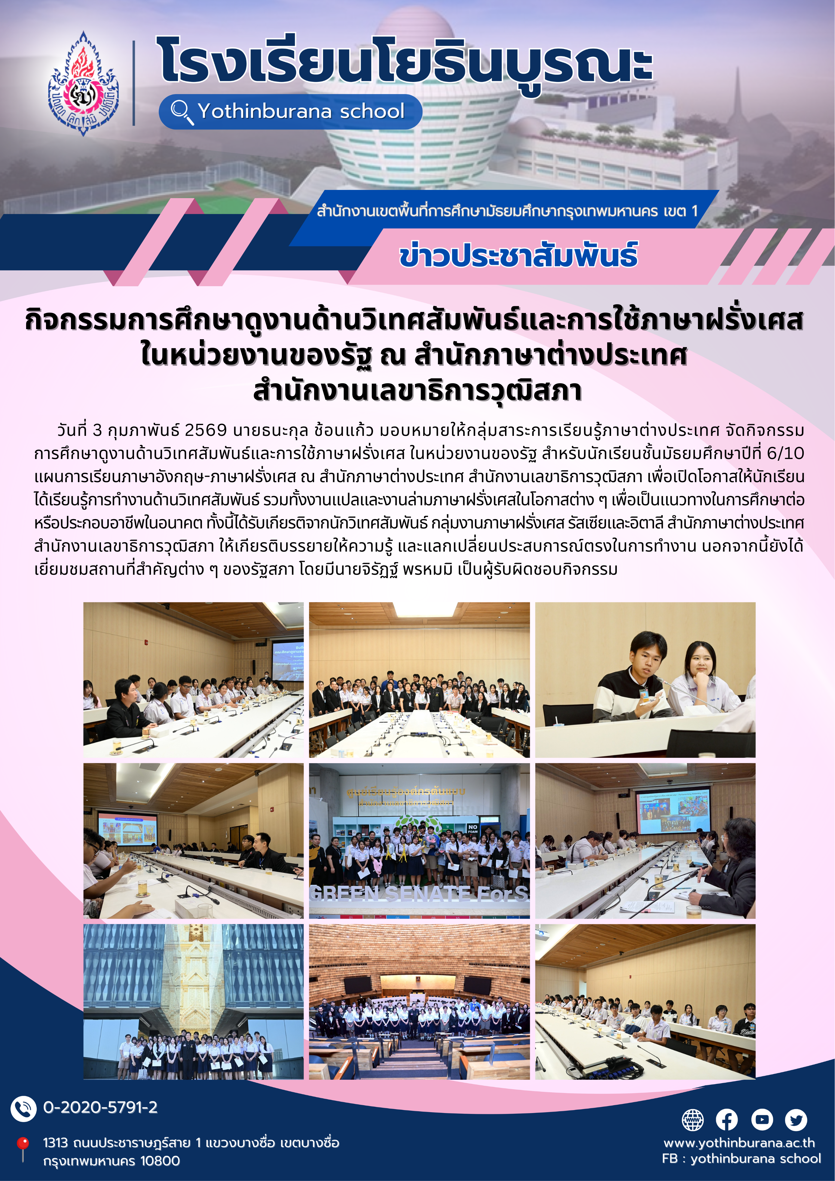 กิจกรรมการศึกษาดูงานด้านวิเทศสัมพันธ์และการใช้ภาษาฝรั่งเศส ในหน่วยงานของรัฐ สำหรับนักเรียนชั้นมัธยมศึกษาปีที่ 6/10 แผนการเรียนภาษาอังกฤษ-ภาษาฝรั่งเศส ณ สำนักภาษาต่างประเทศ สำนักงานเลขาธิการวุฒิสภา เพื่อเปิดโอกาสให้นักเรียนได้เรียนรู้การทำงานด้านวิเทศสัมพันธ์ รวมทั้งงานแปลและงานล่ามภาษาฝรั่งเศสในโอกาสต่างๆ เพื่อเป็นแนวทางในการศึกษาต่อหรือประกอบอาชีพในอนาคต ทั้งนี้ได้รับเกียรติจากนักวิเทศสัมพันธ์ กลุ่มงานภาษาฝรั่งเศส รัสเซียและอิตาลี สำนักภาษาต่างประเทศ สำนักงานเลขาธิการวุฒิสภา ให้เกียรติบรรยายให้ความรู้ และแลกเปลี่ยนประสบการณ์ตรงในการทำงาน นอกจากนี้ยังได้เยี่ยมชมสถานที่สำคัญต่างๆของรัฐสภา โดยมีนายจิรัฏฐ์ พรหมมิ เป็นผู้รับผิดชอบกิจกรรม