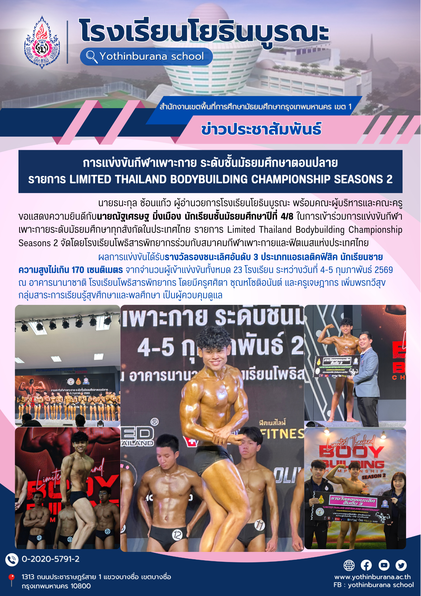 นายธนะกุล ช้อนแก้ว ผู้อำนวยการโรงเรียนโยธินบูรณะ พร้อมคณะผู้บริหารและคณะครู ขอแสดงความยินดีกับนายณัฐเศรษฐ มิ่งเมือง นักเรียนชั้นมัธยมศึกษาปีที่ 4/8 ในการเข้าร่วมการแข่งขันกีฬาเพาะกายระดับมัธยมศึกษาทุกสังกัดในประเทศไทย รายการ Limited Thailand Bodybuilding Championship Seasons 2 จัดโดยโรงเรียนโพธิสารพิทยากรร่วมกับสมาคมกีฬาเพาะกายและฟิตเนสแห่งประเทศไทย