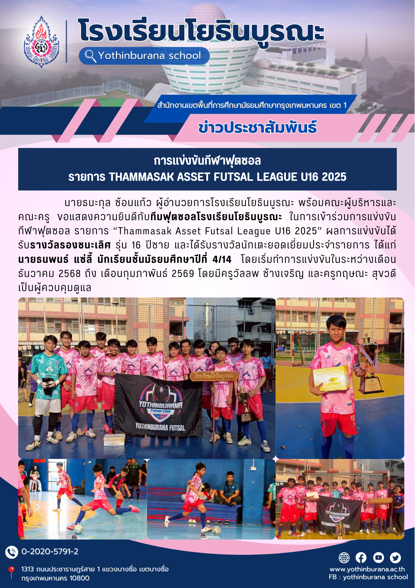 นายธนะกุล ช้อนแก้ว ผู้อำนวยการโรงเรียนโยธินบูรณะ พร้อมคณะผู้บริหารและคณะครู ขอแสดงความยินดีกับทีมฟุตซอลโรงเรียนโยธินบูรณะ ในการเข้าร่วมการแข่งขันกีฬาฟุตซอล รายการ Thammasak Asset Futsal League U16 2025 ผลการแข่งขันได้รับรางวัลรองชนะเลิศ รุ่น 16 ปีชาย และได้รับรางวัลนักเตะยอดเยี่ยมประจำรายการ ได้แก่ นายธนพนธ์ แซ่ลี้ นักเรียนชั้นมัธยมศึกษาปีที่ 4/14 โดยเริ่มทำการแข่งขันในระหว่างเดือนธันวาคม 2568 ถึง เดือนกุมภาพันธ์ 2569 โดยมีครูวัลลพ ช้างเจริญ และครูกฤษณะ สุขวดี เป็นผู้ควบคุมดูแล