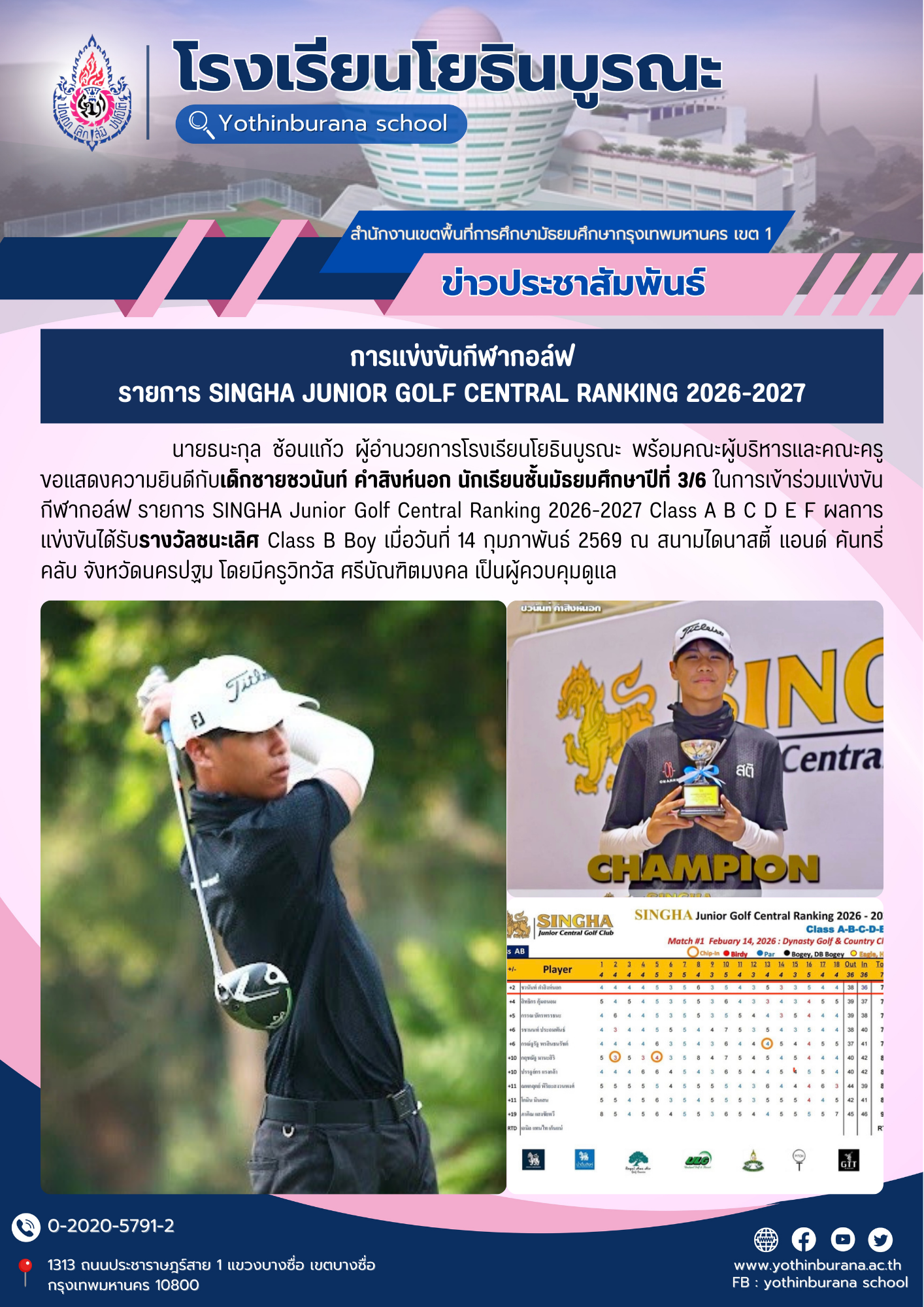 นายธนะกุล ช้อนแก้ว ผู้อำนวยการโรงเรียนโยธินบูรณะ พร้อมคณะผู้บริหารและคณะครู ขอแสดงความยินดีกับเด็กชายชวนันท์ คำสิงห์นอก นักเรียนชั้นมัธยมศึกษาปีที่ 3/6 ในการเข้าร่วมแข่งขันกีฬากอล์ฟ รายการ SINGHA Junior Golf Central Ranking 2026-2027 Class A B C D E F ผลการแข่งขันได้รับรางวัลชนะเลิศ Class B Boy เมื่อวันที่ 14 กุมภาพันธ์ 2569 ณ สนามไดนาสตี้ แอนด์ คันทรี่คลับ จังหวัดนครปฐม โดยมีครูวิทวัส ศรีบัณฑิตมงคล เป็นผู้ควบคุมดูแล