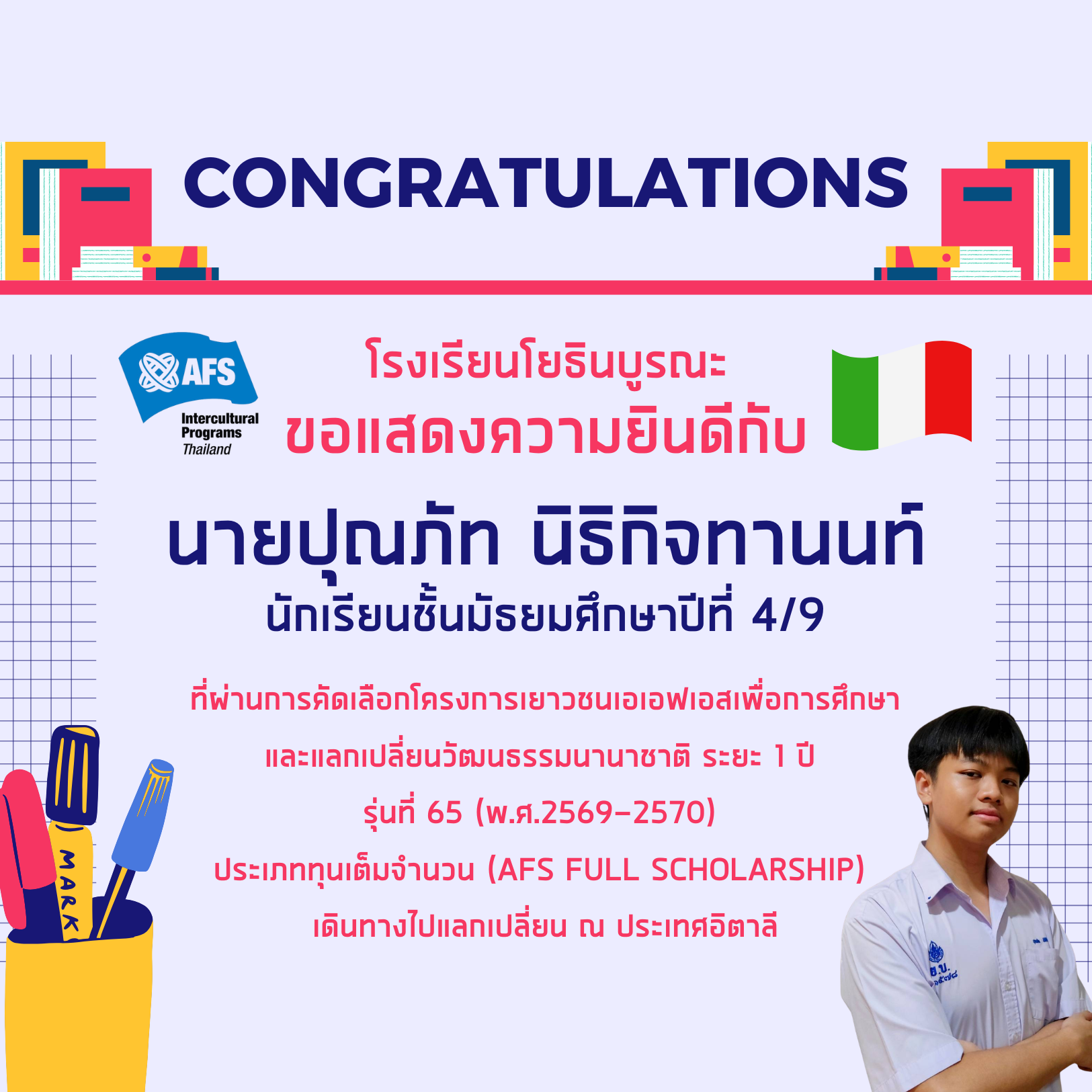นายปุณภัท นิธิกิจทานนท์ นักเรียนชั้นมัธยมศึกษาปีที่ 4/9 ที่ผ่านการคัดเลือกโครงการเยาวชนเอเอฟเอสเพื่อการศึกษาและแลกเปลี่ยนวัฒนธรรมนานาชาติ ระยะ 1 ปีรุ่นที่ 65 (พ.ศ.2569-2570) ประเภททุนเต็มจำนวน (AFS Full Scholarship) เดินทางไปแลกเปลี่ยน ณ ประเทศอิตาลี