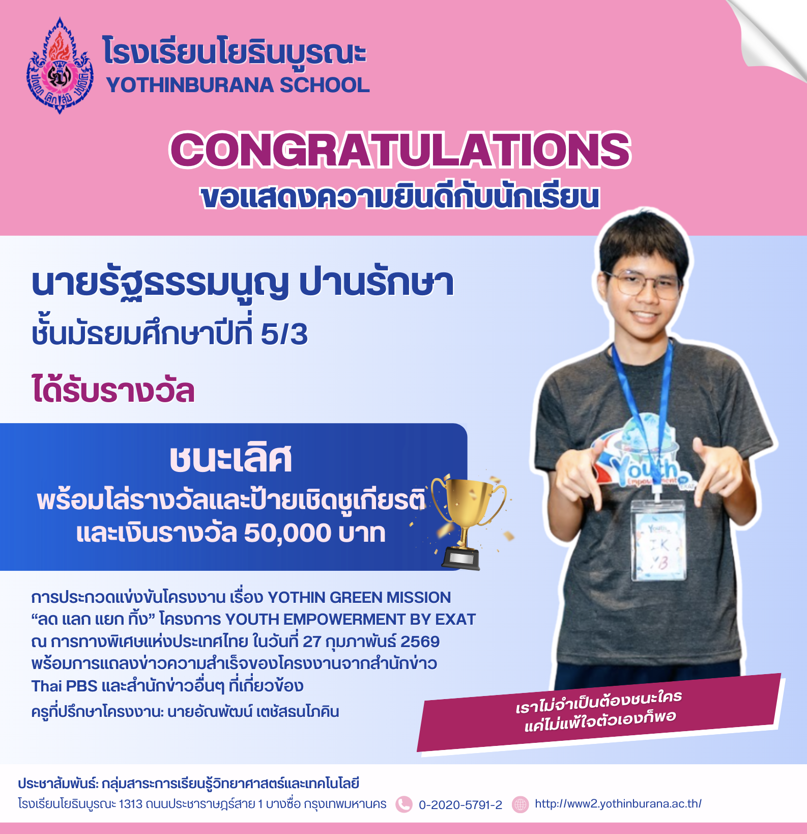 โรงเรียนโยธินบูรณะขอแสดงความยินดีกับ นายรัฐธรรมนูญ ปานรักษา (นักเรียนระดับชั้นมัธยมศึกษาปีที่ 5/3 โครงการวิทยาศาสตร์พลังสิบ) ได้รับรางวัลชนะเลิศ พร้อมโล่รางวัลและป้ายเชิดชูเกียรติ และเงินรางวัล จำนวน 50,000 บาท จากการประกวดแข่งขันโครงงาน เรื่อง Yothin Green Mission ลก แลก แยก ทิ้ง โครงการ YOUTH EMPOWERMENT BY EXAT ณ การทางพิเศษแห่งประเทศไทย ในวันที่ 27 กุมภาพันธ์ 2569 พร้อมการแถลงข่าวความสำเร็จของโครงงานจากสำนักข่าว Thai PBS และสำนักข่าวอื่นๆ ที่เกี่ยวข้อง