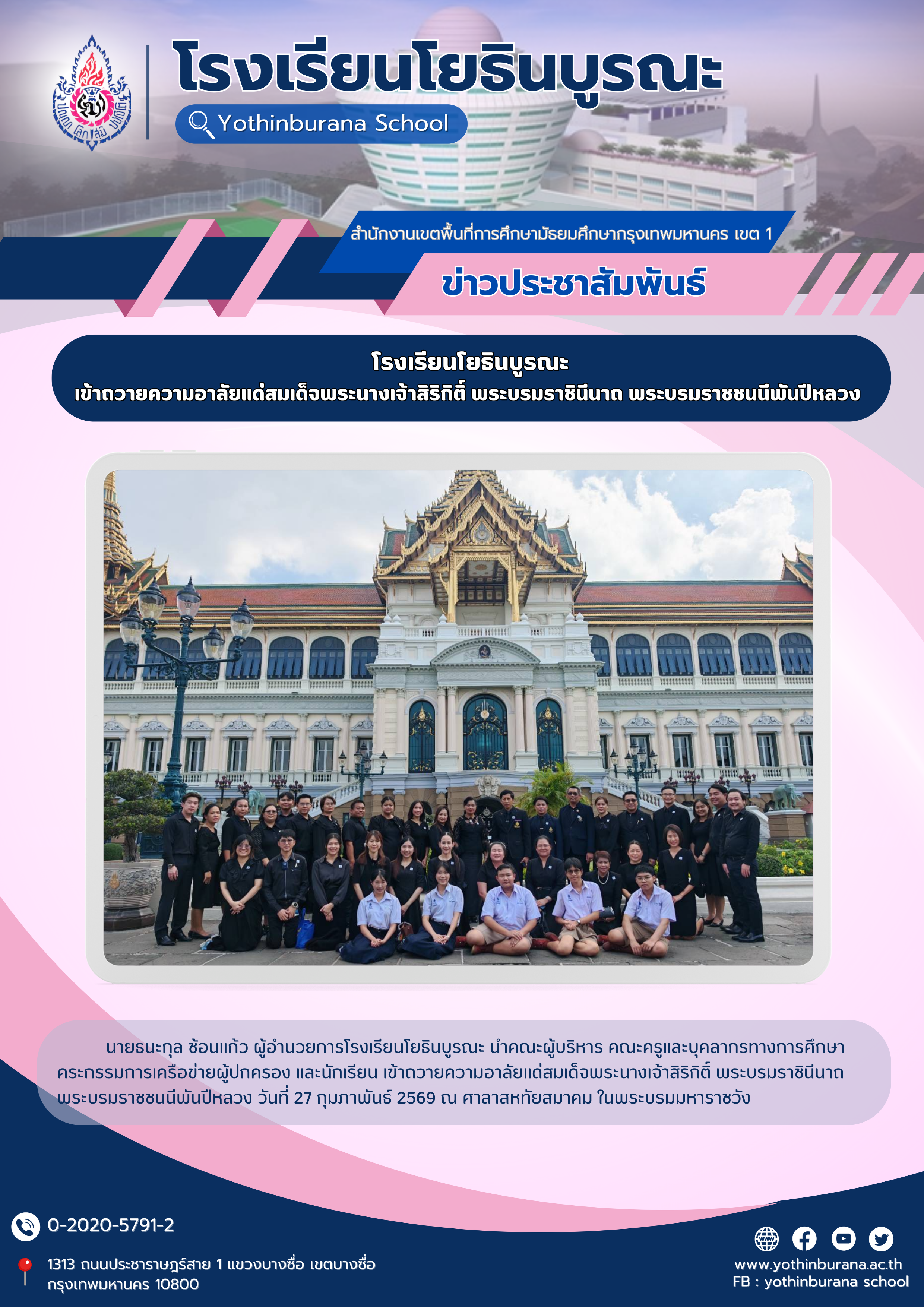นายธนะกุล ช้อนแก้ว ผู้อำนวยการโรงเรียนโยธินบูรณะ นำคณะผู้บริหาร คณะครูและบุคลากรทางการศึกษา คระกรรมการเครือข่ายผู้ปกครอง และนักเรียน เข้าถวายความอาลัยแด่สมเด็จพระนางเจ้าสิริกิติ์ พระบรมราชินีนาถ พระบรมราชชนนีพันปีหลวง วันที่ 27 กุมภาพันธ์ 2569 ณ ศาลาสหทัยสมาคม ในพระบรมมหาราชวัง
