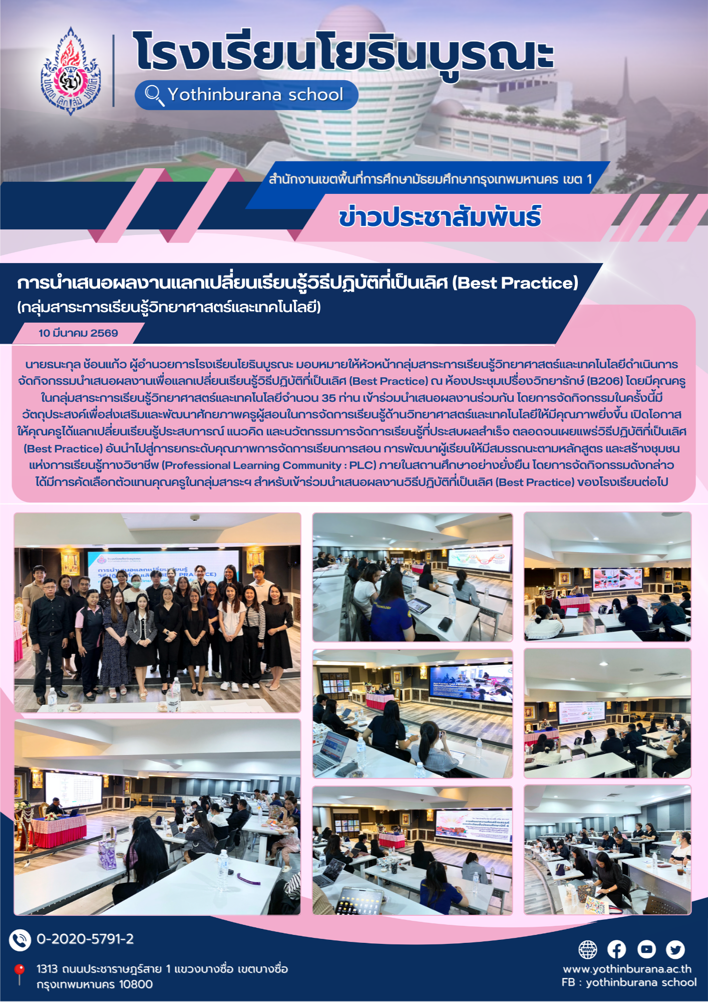 วันที่ 10 มีนาคม 2569 นายธนะกุล ช้อนแก้ว ผู้อำนวยการโรงเรียนโยธินบูรณะ มอบหมายให้หัวหน้ากลุ่มสาระการเรียนรู้วิทยาศาสตร์และเทคโนโลยีดำเนินการจัดกิจกรรมนำเสนอผลงานเพื่อแลกเปลี่ยนเรียนรู้วิธีปฏิบัติที่เป็นเลิศ (Best Practice) ณ ห้องประชุมเปรื่องวิทยารักษ์ (B206) โดยมีคุณครูในกลุ่มสาระการเรียนรู้วิทยาศาสตร์และเทคโนโลยีจำนวน 35 ท่าน เข้าร่วมนำเสนอผลงานร่วมกัน โดยการจัดกิจกรรมในครั้งนี้มีวัตถุประสงค์เพื่อส่งเสริมและพัฒนาศักยภาพครูผู้สอนในการจัดการเรียนรู้ด้านวิทยาศาสตร์และเทคโนโลยีให้มีคุณภาพยิ่งขึ้น เปิดโอกาสให้คุณครูได้แลกเปลี่ยนเรียนรู้ประสบการณ์ แนวคิด และนวัตกรรมการจัดการเรียนรู้ที่ประสบผลสำเร็จ ตลอดจนเผยแพร่วิธีปฏิบัติที่เป็นเลิศ (Best Practice) อันนำไปสู่การยกระดับคุณภาพการจัดการเรียนการสอน การพัฒนาผู้เรียนให้มีสมรรถนะตามหลักสูตร และสร้างชุมชนแห่งการเรียนรู้ทางวิชาชีพ (Professional Learning Community : PLC) ภายในสถานศึกษาอย่างยั่งยืน โดยการจัดกิจกรรมดังกล่าวได้มีการคัดเลือกตัวแทนคุณครูในกลุ่มสาระฯ สำหรับเข้าร่วมนำเสนอผลงานวิธีปฏิบัติที่เป็นเลิศ (Best Practice) ของโรงเรียนต่อไป