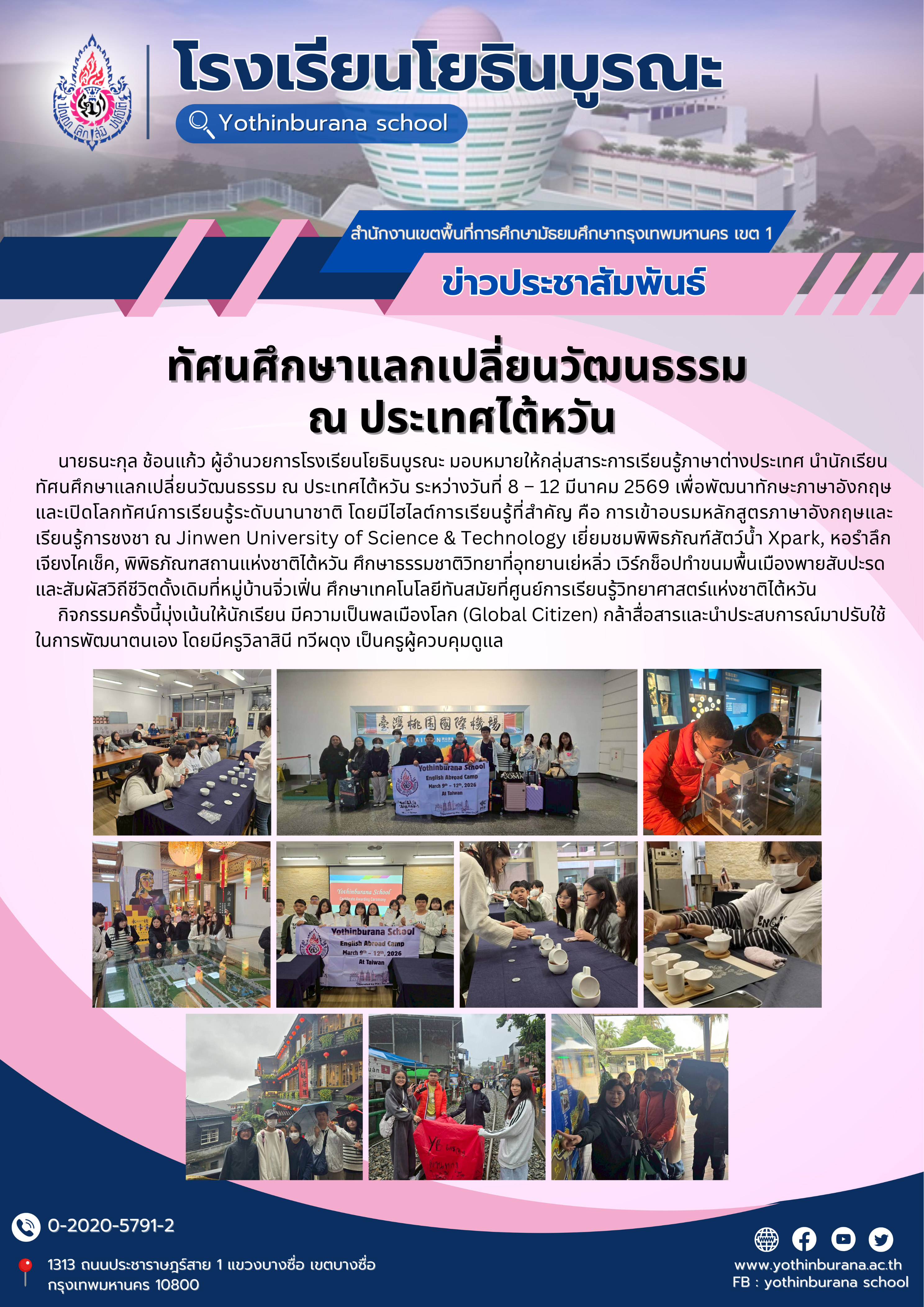 นายธนะกุล ช้อนแก้ว ผู้อำนวยการโรงเรียนโยธินบูรณะ มอบหมายให้กลุ่มสาระการเรียนรู้ภาษาต่างประเทศ นำนักเรียนทัศนศึกษาแลกเปลี่ยนวัฒนธรรม ณ ประเทศไต้หวัน ระหว่างวันที่ 812 มีนาคม 2569 เพื่อพัฒนาทักษะภาษาอังกฤษและเปิดโลกทัศน์การเรียนรู้ระดับนานาชาติโดยมีไฮไลต์การเรียนรู้ที่สำคัญ คือ การเข้าอบรมหลักสูตรภาษาอังกฤษและเรียนรู้การชงชา ณ Jinwen University of Science & Technology เยี่ยมชมพิพิธภัณฑ์สัตว์น้ำ Xpark, หอรำลึกเจียงไคเช็ค, พิพิธภัณฑสถานแห่งชาติไต้หวัน ศึกษาธรรมชาติวิทยาที่อุทยานเย่หลิ่ว เวิร์กช็อปทำขนมพื้นเมืองพายสับปะรด และสัมผัสวิถีชีวิตดั้งเดิมที่หมู่บ้านจิ่วเฟิ่น ศึกษาเทคโนโลยีทันสมัยที่ศูนย์การเรียนรู้วิทยาศาสตร์แห่งชาติไต้หวัน